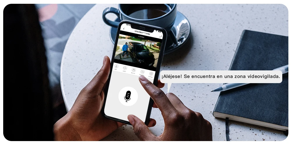 Microfone e alto-falante integrados permitem que você ouça e fale com quem a câmera captar em tempo real com clareza. A tecnologia avançada de cancelamento de eco da G.Craftsman é capaz de transmitir sons de alta qualidade sem ruído.