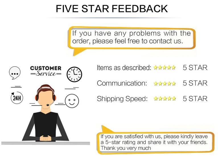 Seu feedback é extremamente importante para o desenvolvimento de nossos negócios, sinceramente convidamos você a deixar um feedback positivo com cinco estrelas com base em sua satisfação com nossos produtos e serviços. Infelizmente, se você planeja nos dar um feedback neutro/negativo devido à sua má experiência de compra conosco, entre em contato conosco a qualquer momento para esclarecer seu descontentamento e resolver o problema.