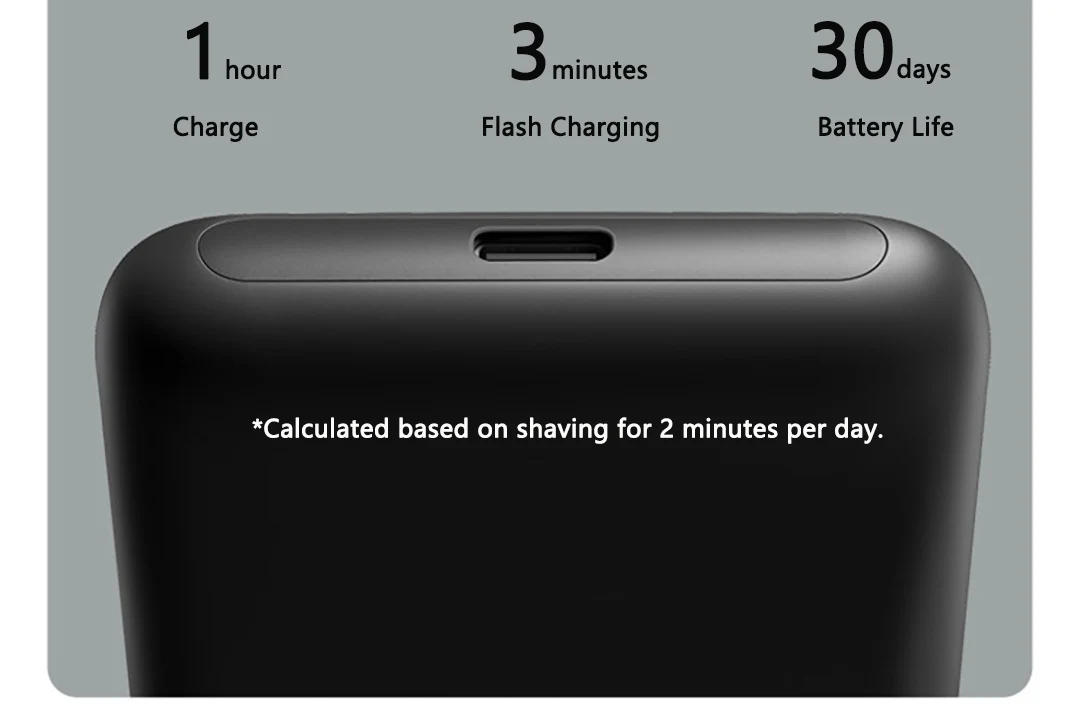 Se a bateria acabar, basta carregá-lo por 3 minutos para obter 5 minutos de barbear.