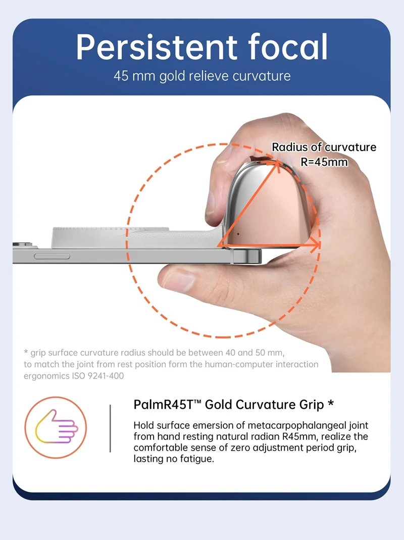 Tecnologia PalmR45™ – Curvatura de 45mm corresponde às articulações da mão (certificado ISO 9241-400).