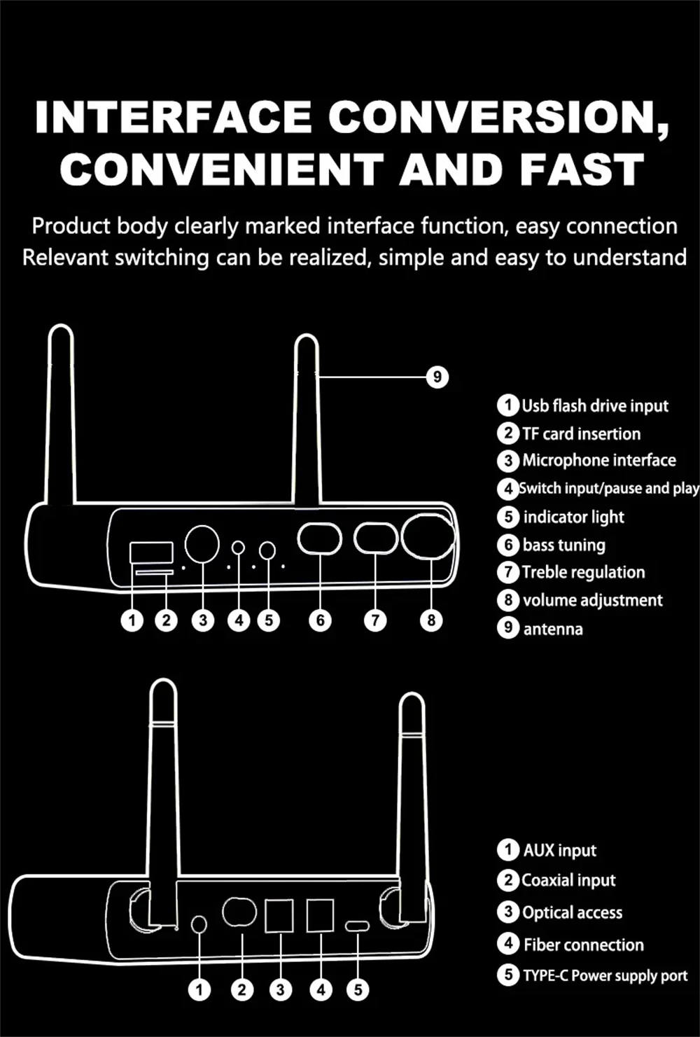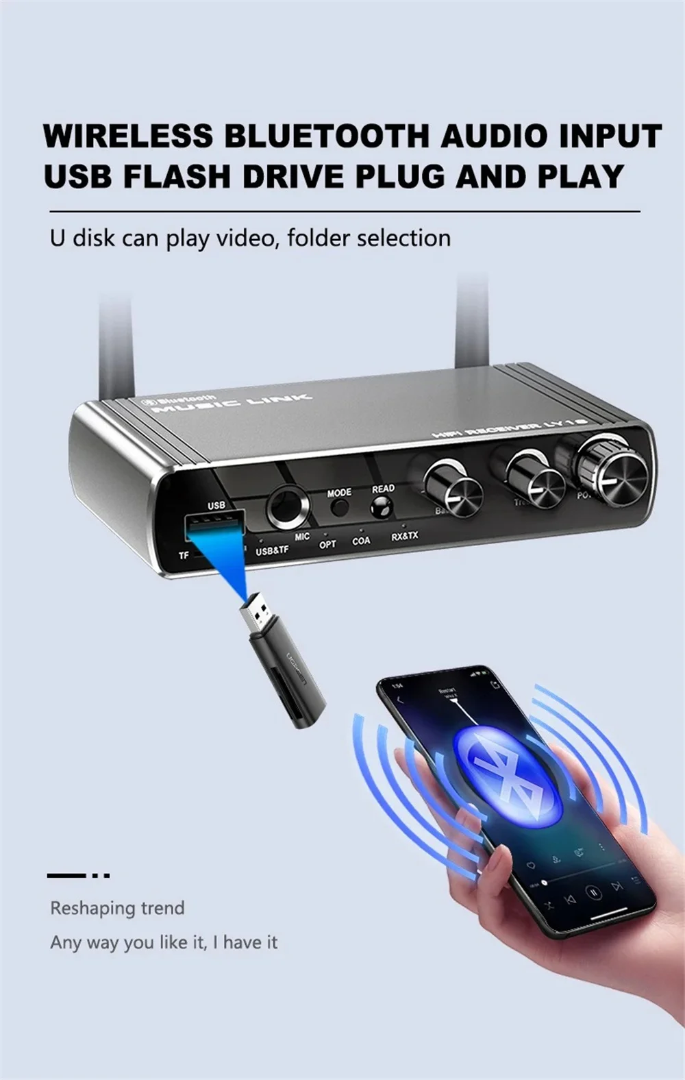 Interface de entrada: fibra óptica/coaxial/AUX/USB/TF/Bluetooth.