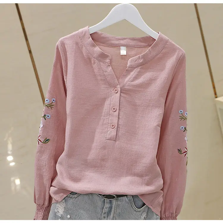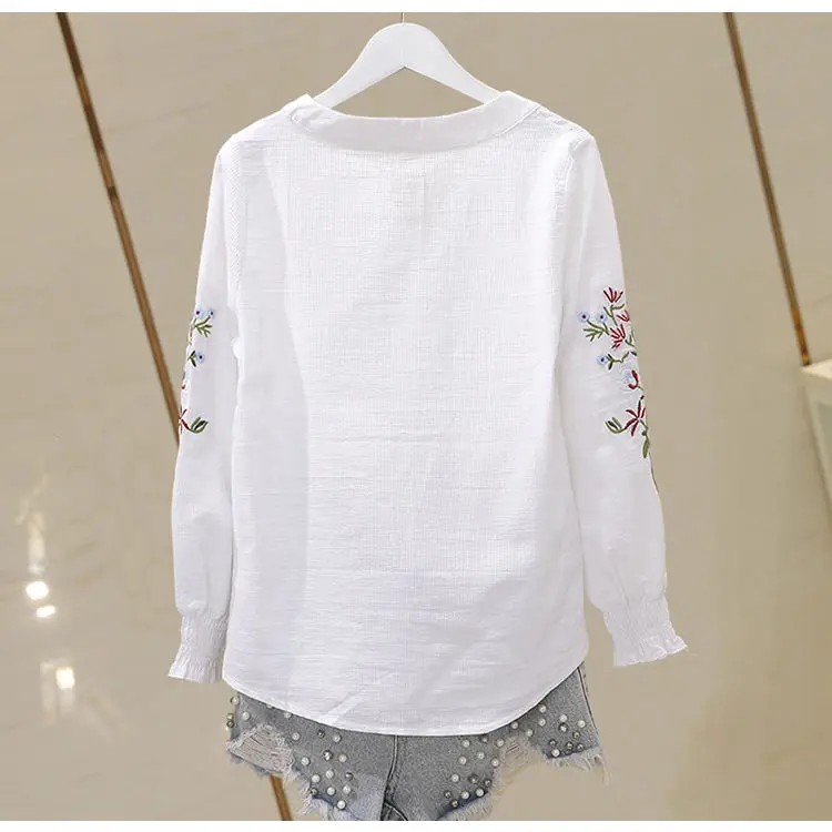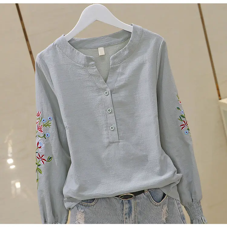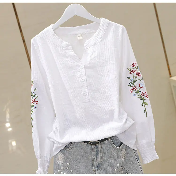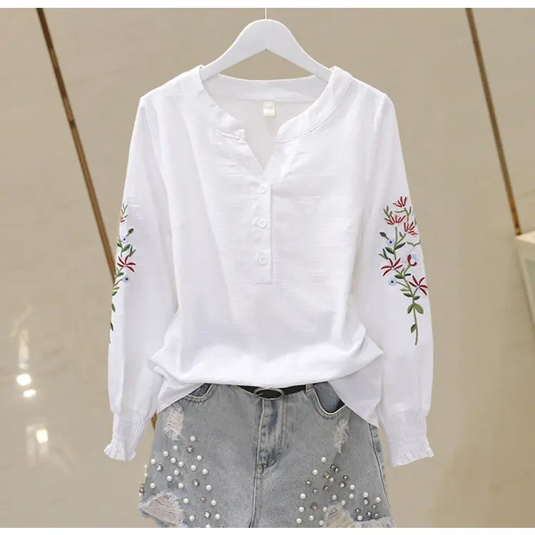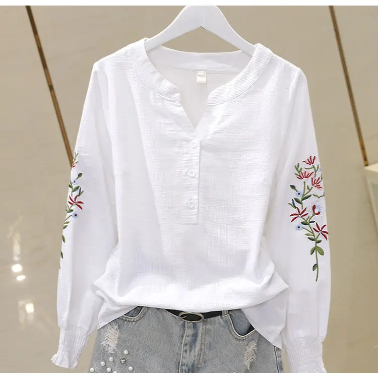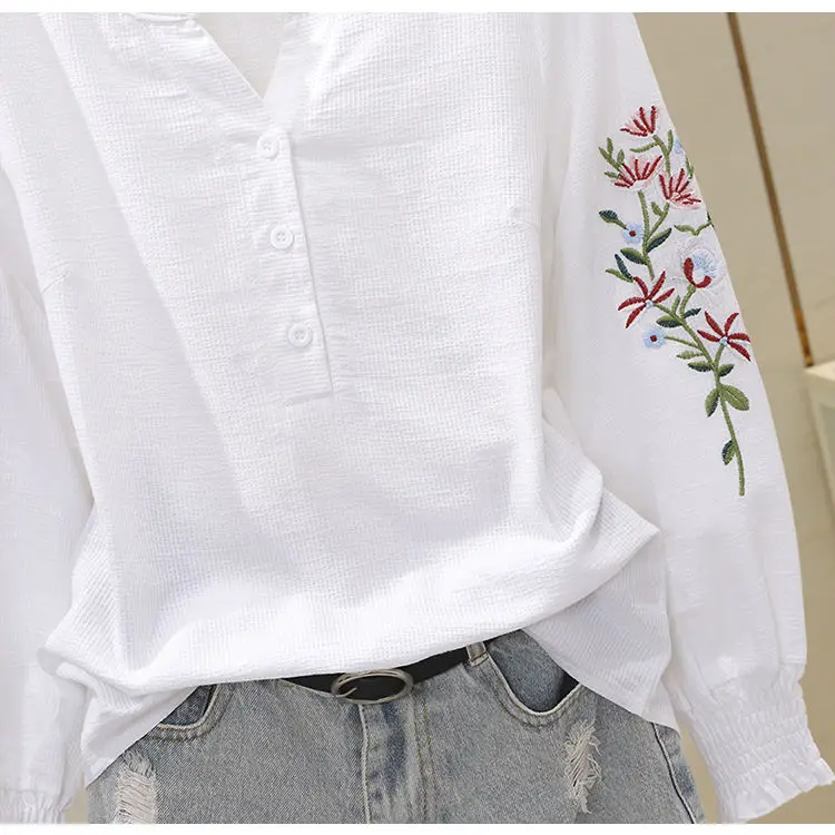 Blusa de algodão bordada para mulheres, decote em v, manga lanterna, pulôver, manga longa, top, outono