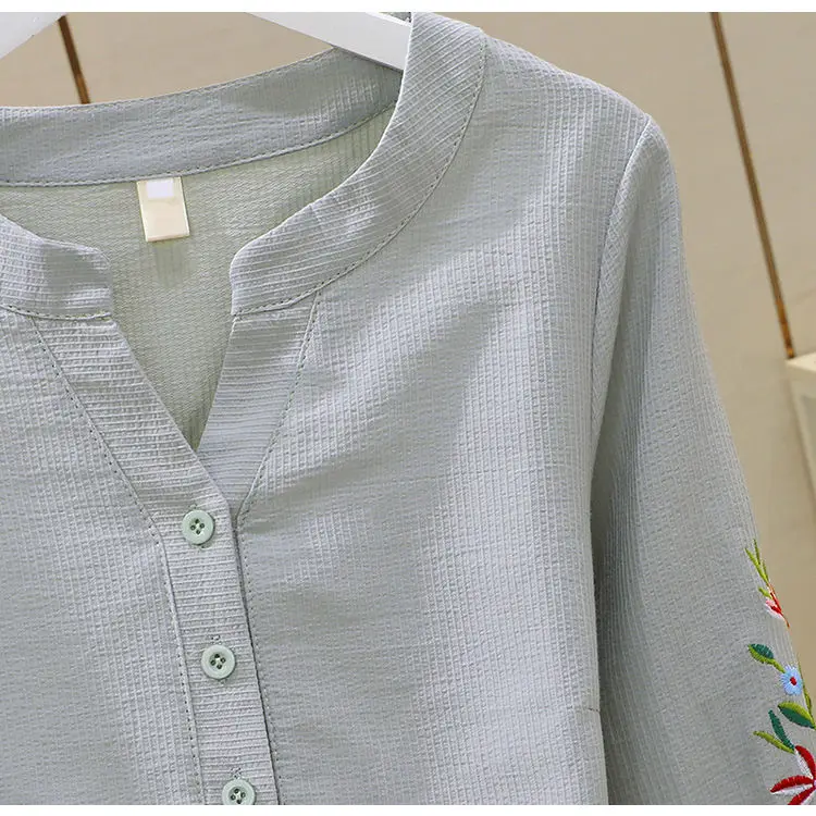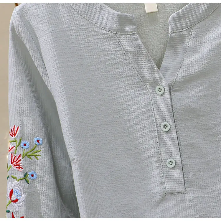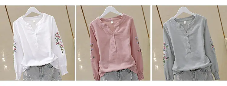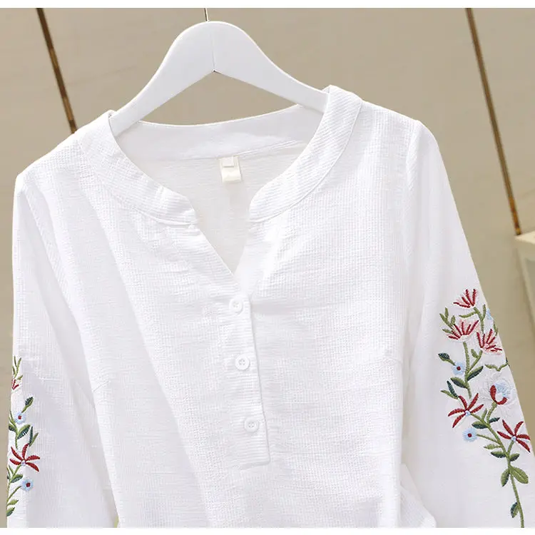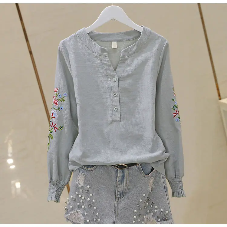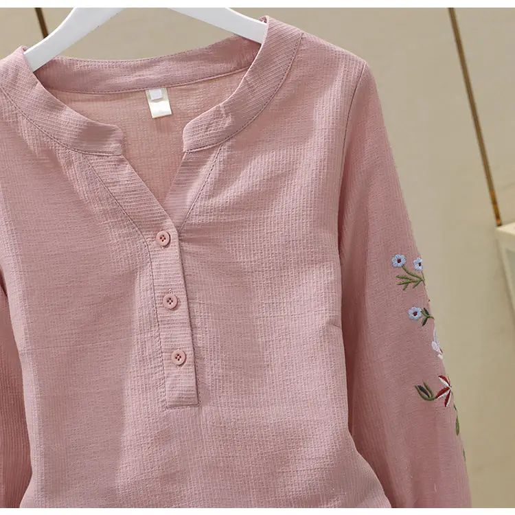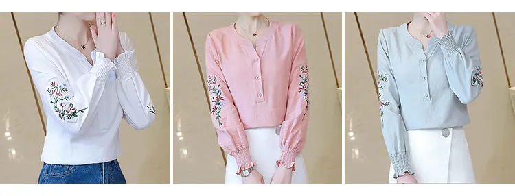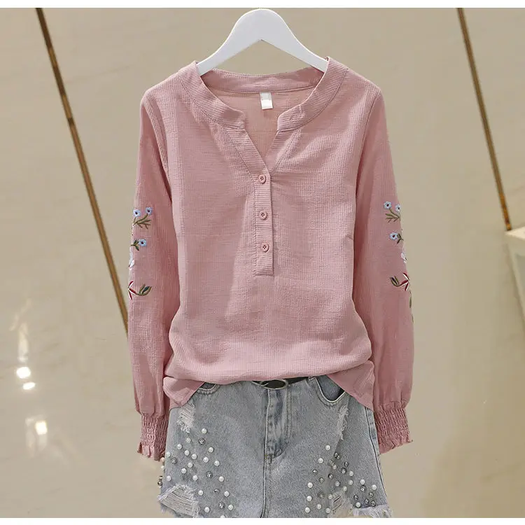 Blusa de algodão bordada para mulheres, decote em v, manga lanterna, pulôver, manga longa, top, outono