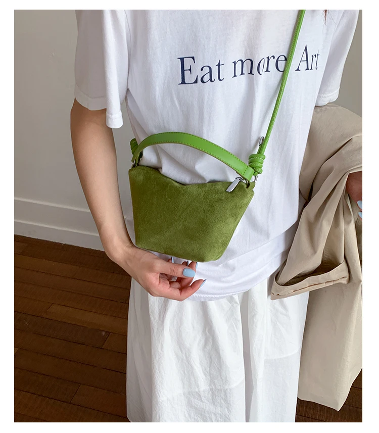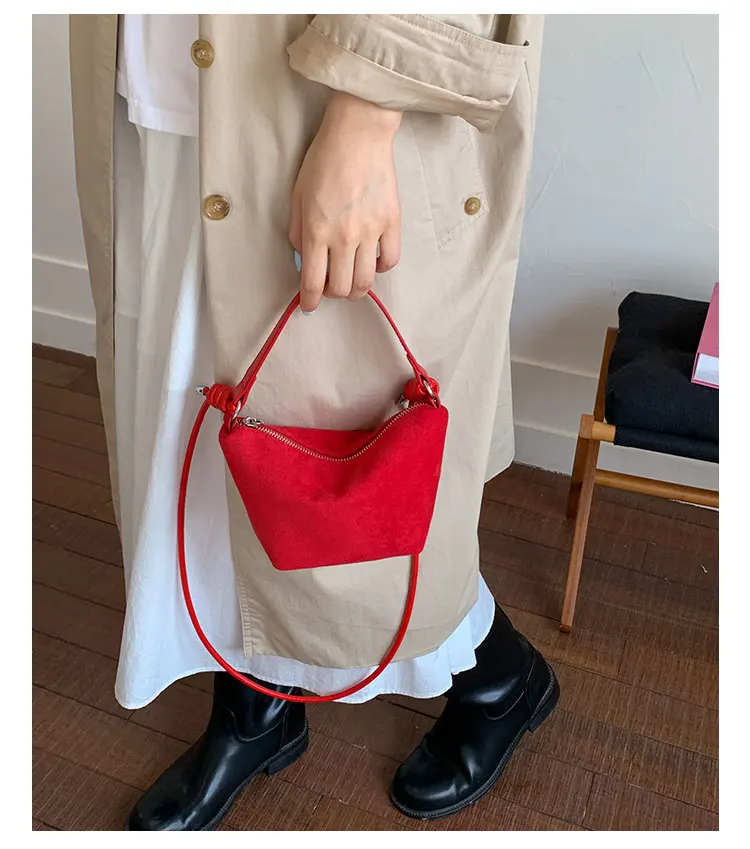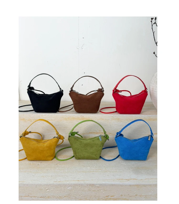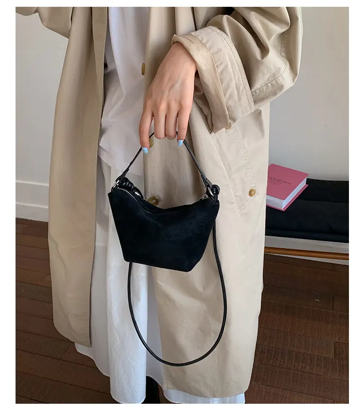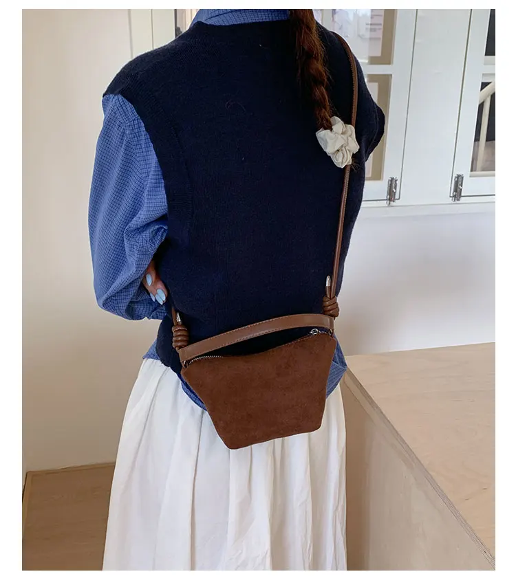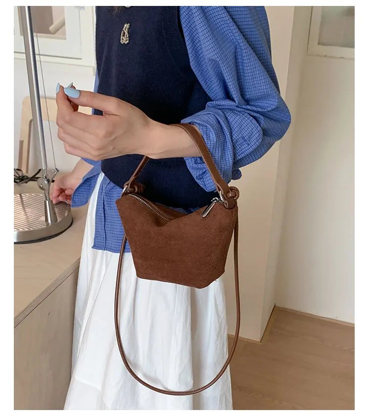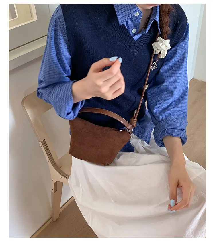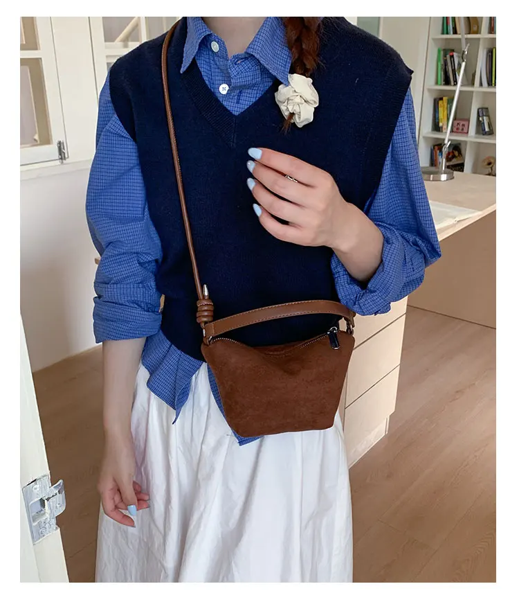 Este pequeno bolso de couro de camurça apresenta um estilo coreano, combinando elegância com um toque vintage.
