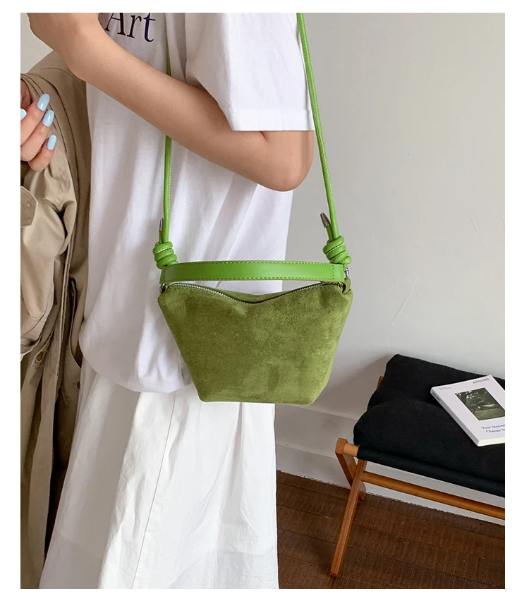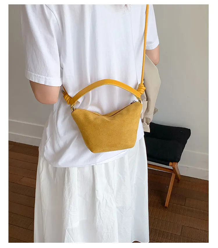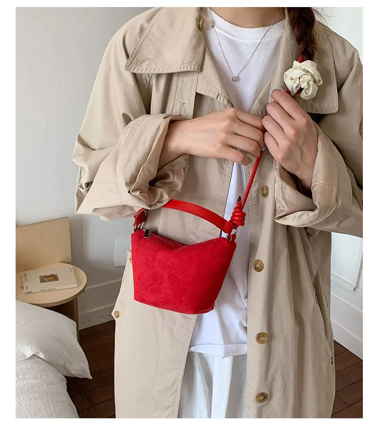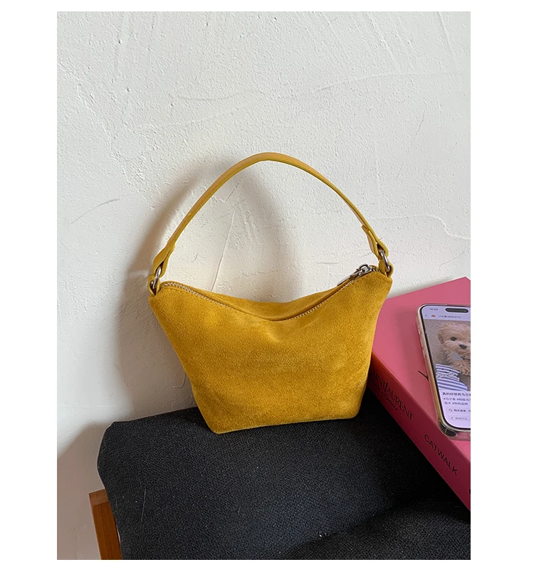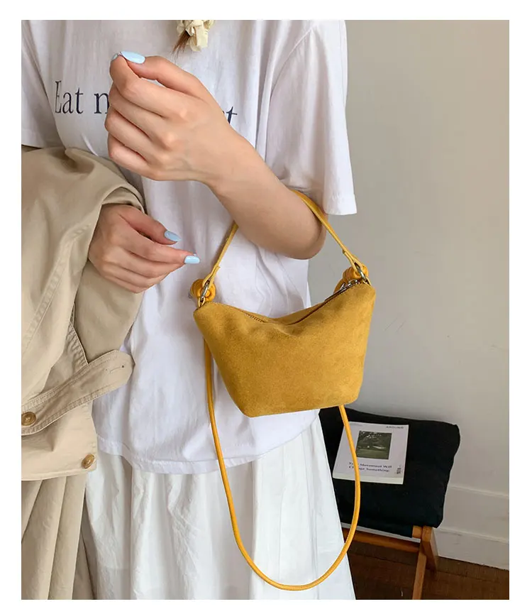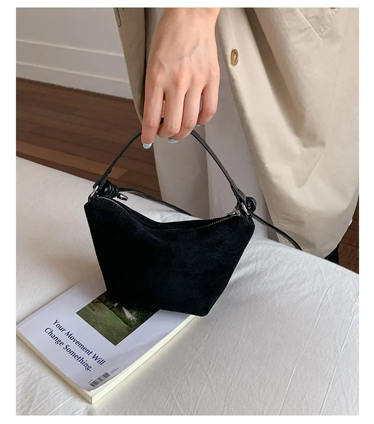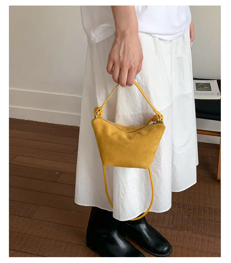 Este pequeno bolso de couro de camurça apresenta um estilo coreano, combinando elegância com um toque vintage.
