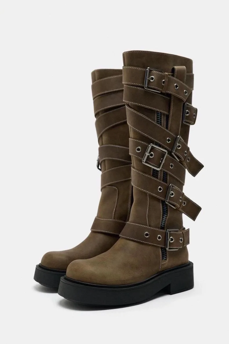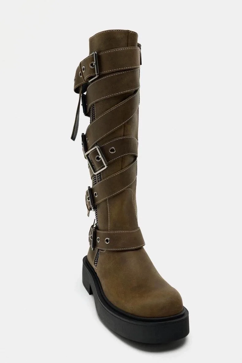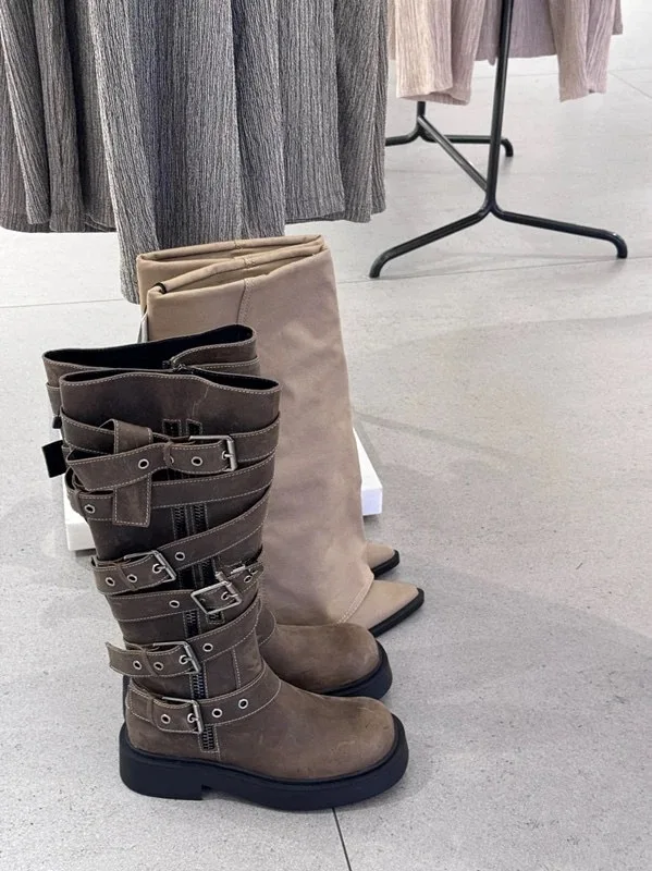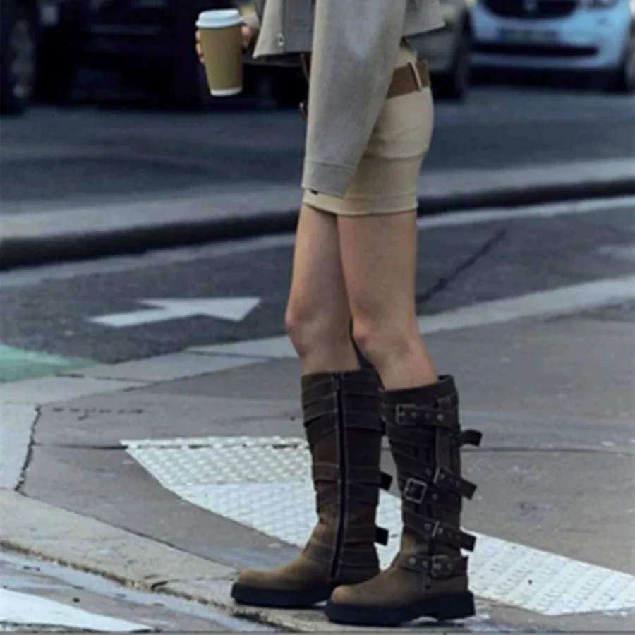 - > Botas de couro PU de joelho alto para mulheres, saltos quadrados, botas longas ocidentais, botas punk pretas, botas góticas, fivela de moda, inverno, 2024