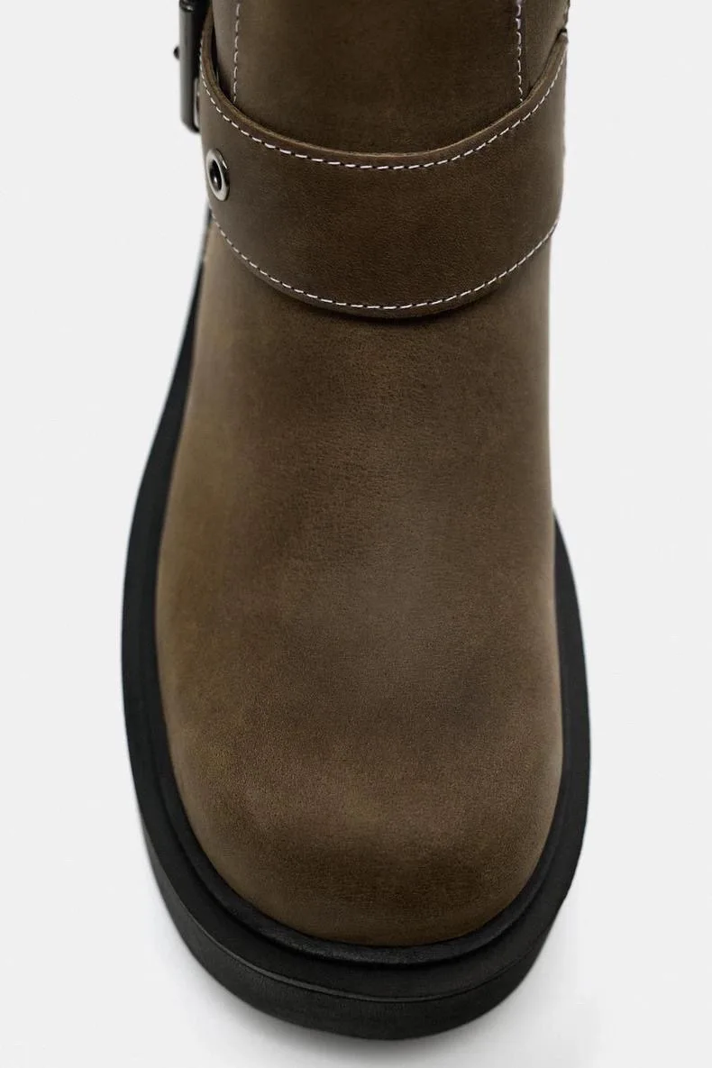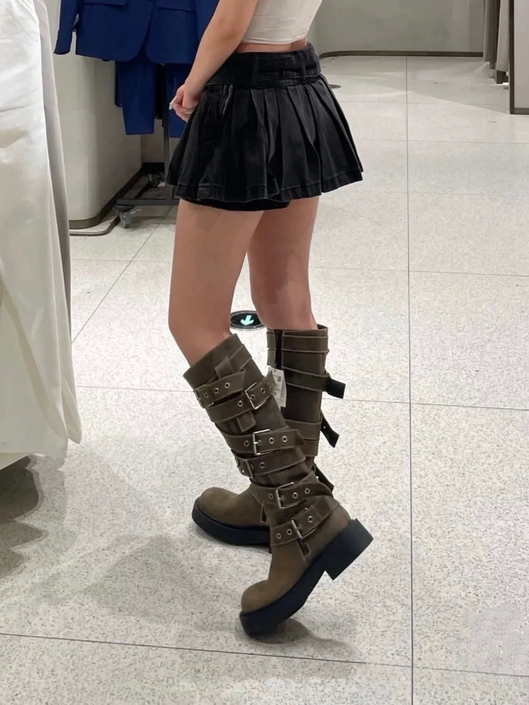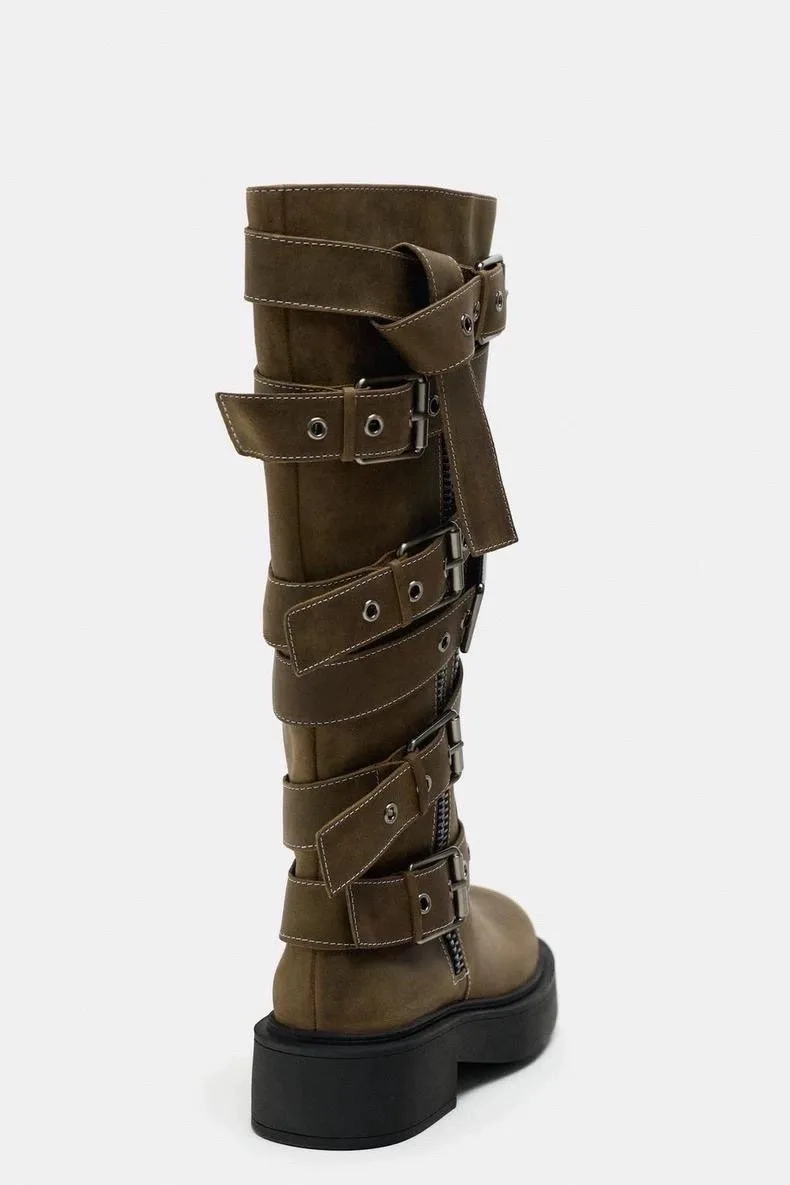 - > Botas de couro PU de joelho alto para mulheres, saltos quadrados, botas longas ocidentais, botas punk pretas, botas góticas, fivela de moda, inverno, 2024