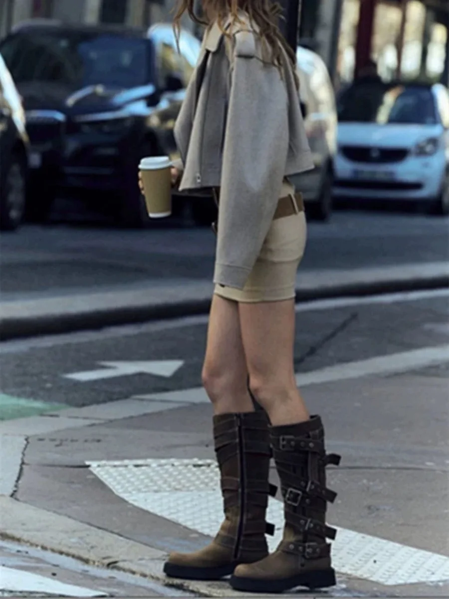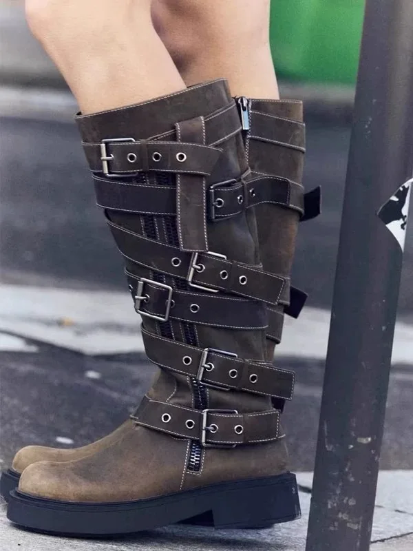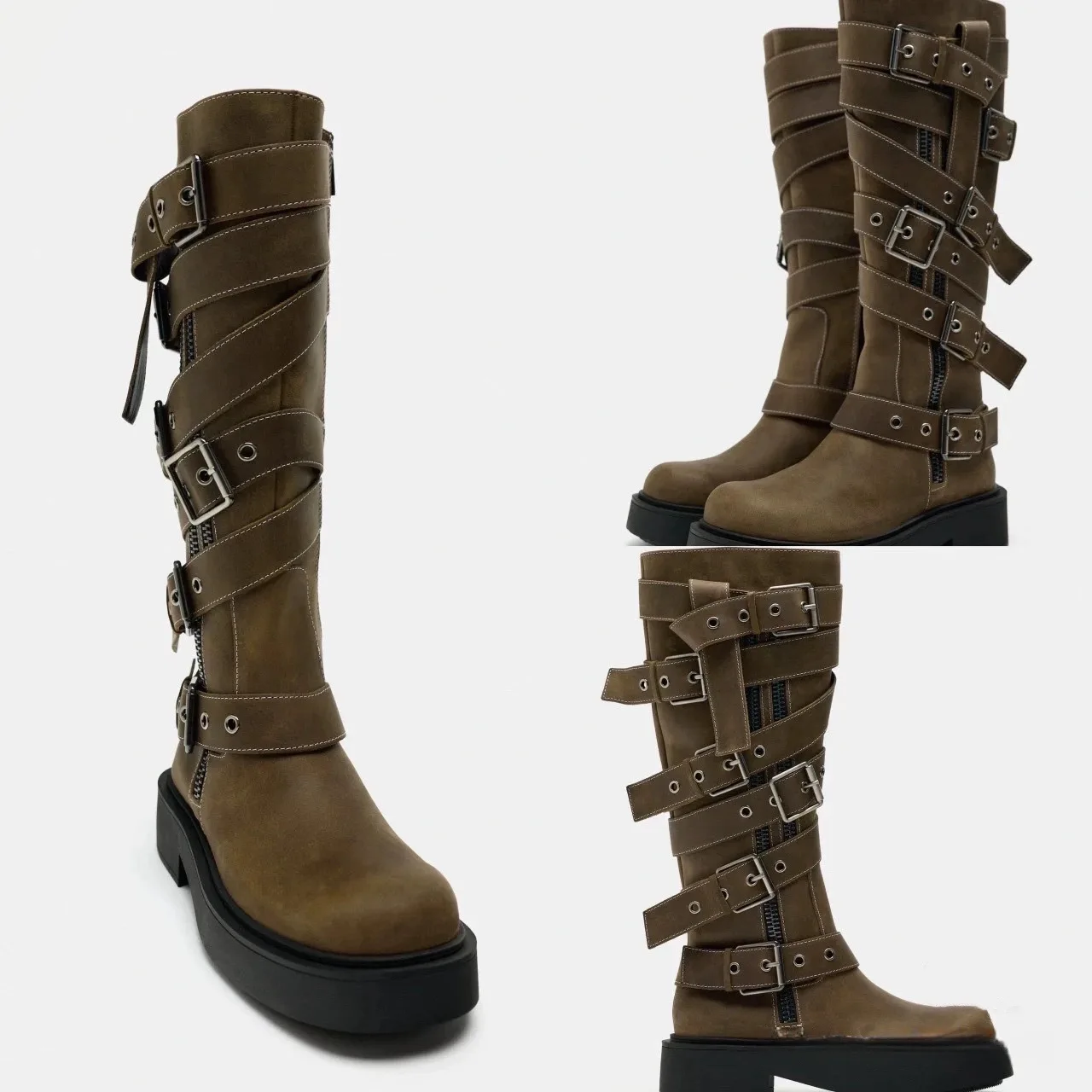 Botas de couro PU de joelho alto para mulheres, saltos quadrados, botas longas ocidentais, botas punk pretas, botas góticas, fivela de moda, inverno, 2024