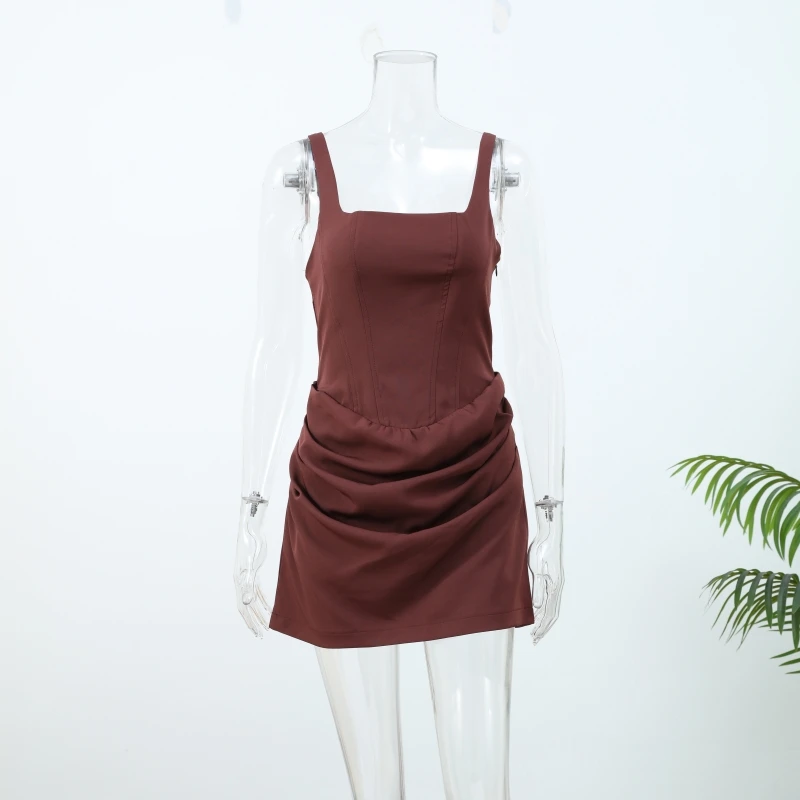 Com uma elegante bainha plissada marrom e um elegante decote em U, este vestido exala elegância e sofisticação.