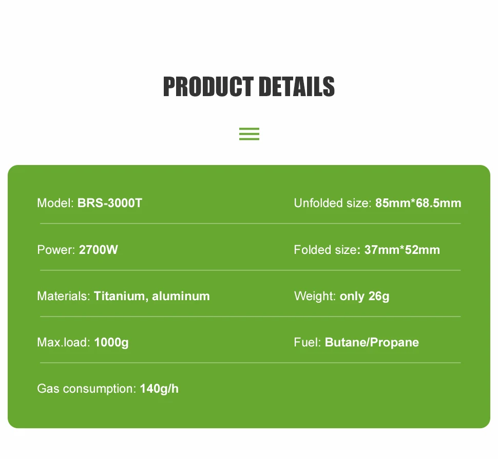 [Leve] O fogão BRS 3000T é extremamente leve.Pesa apenas 26g e é extremamente compacto.Ele vem em uma bolsa verde brilhante que é altamente visível em quase qualquer superfície.