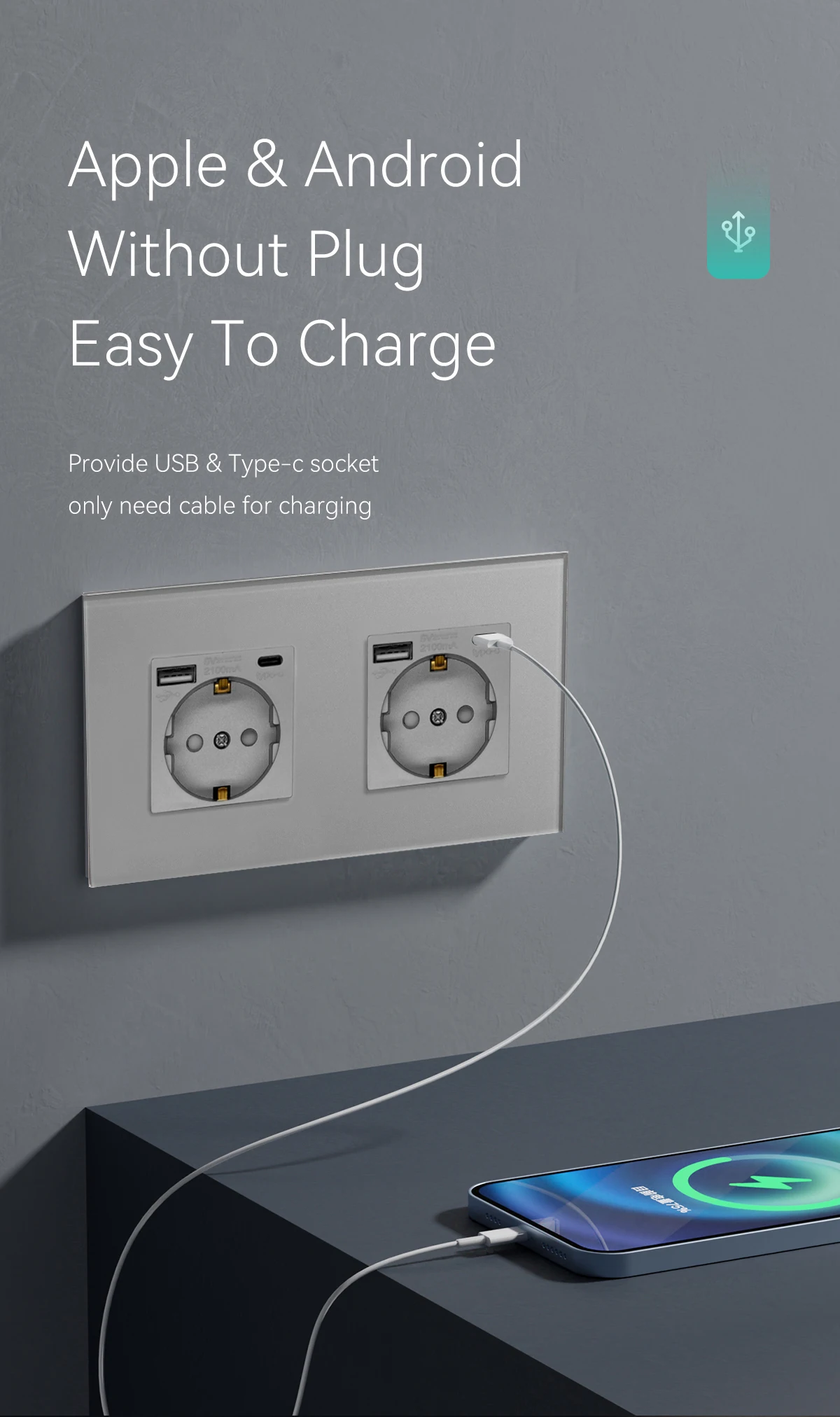 - > Bseed 1/2/3gang interruptor de toque 1way interruptores de luz de parede tomada da ue com interfaces usb tipo-c painel de vidro luz de fundo azul