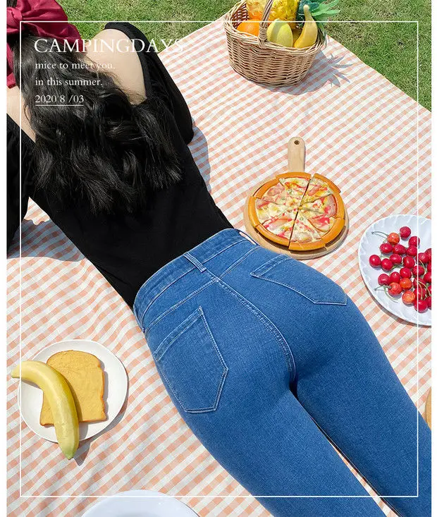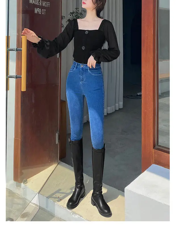 O design de pés finos destas calças de jeans realça a forma das pernas, criando um visual mais atraente.