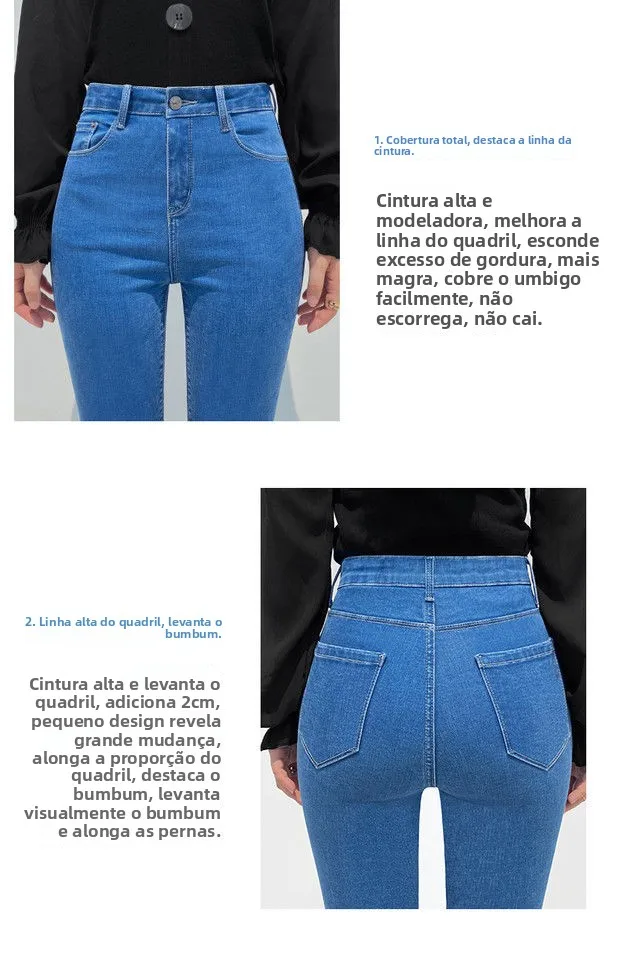 A cintura alta destas calças de jeans realça a silhueta feminina, proporcionando um visual mais alongado e magro.