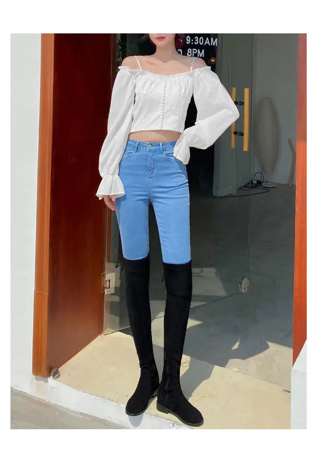 Calça Jeans Fena de Cintura Alta Elástica, Crimento 7/8, Estilo Verão, Ajuste Fino, Skinny, Azul Céu, com Controle de ...