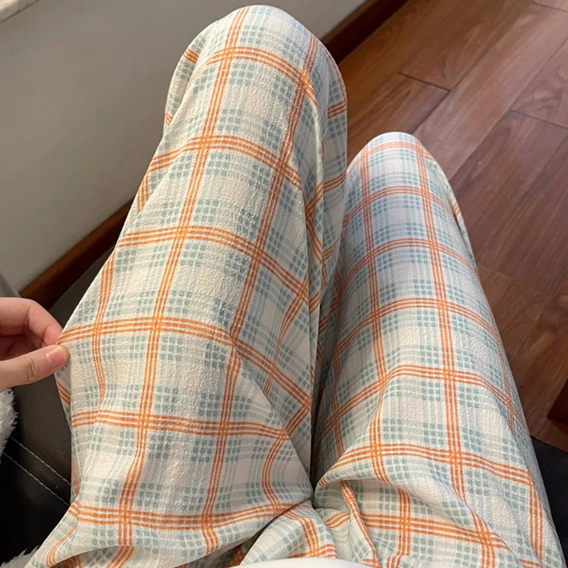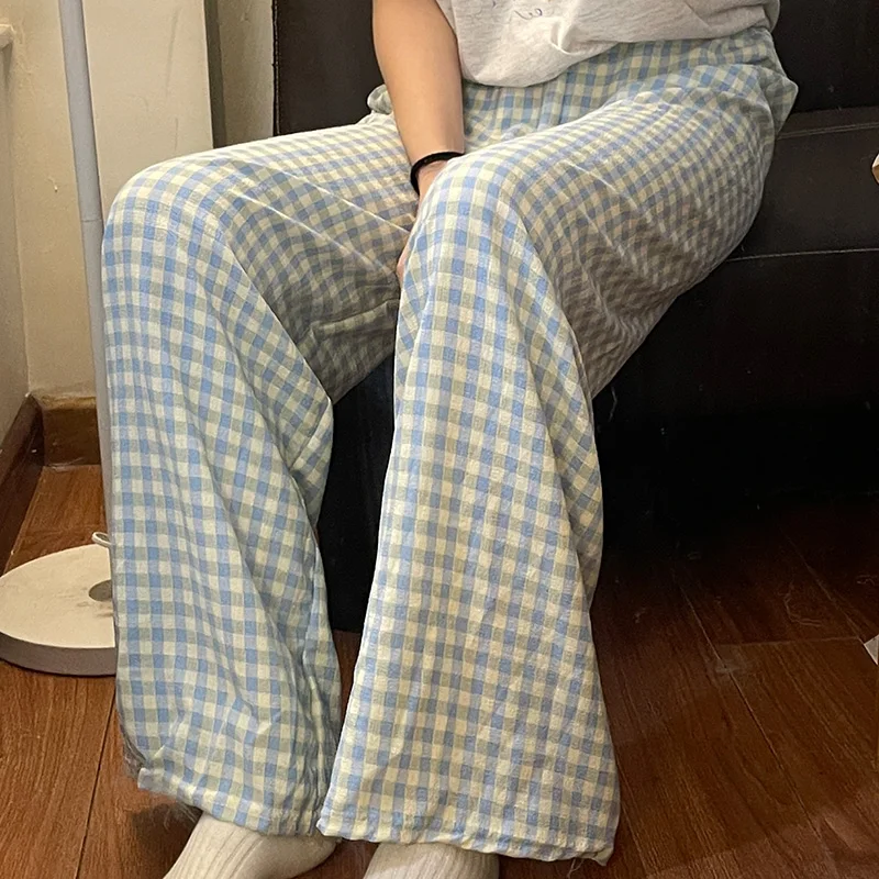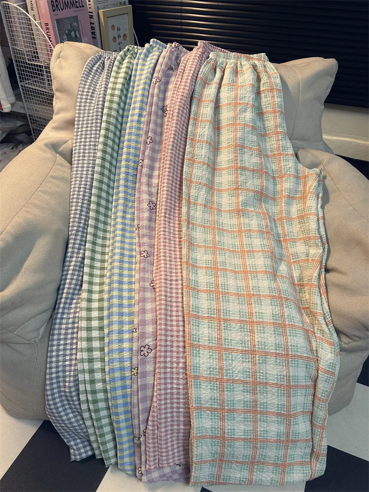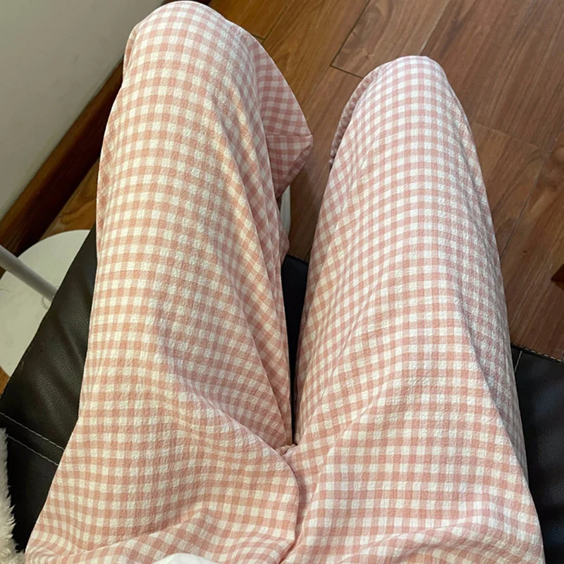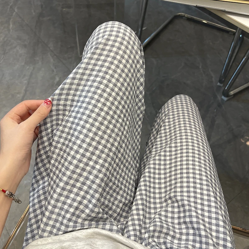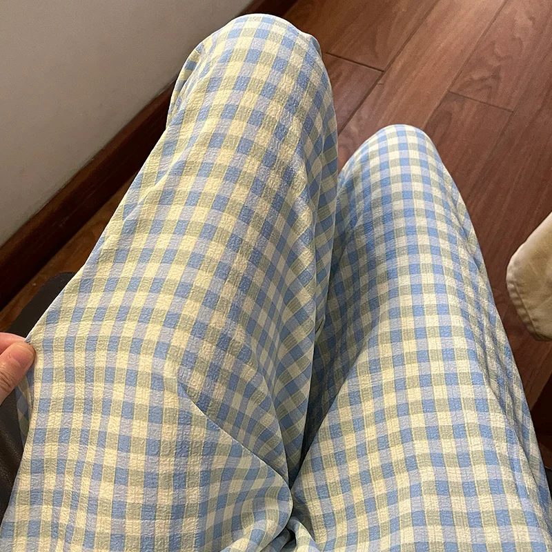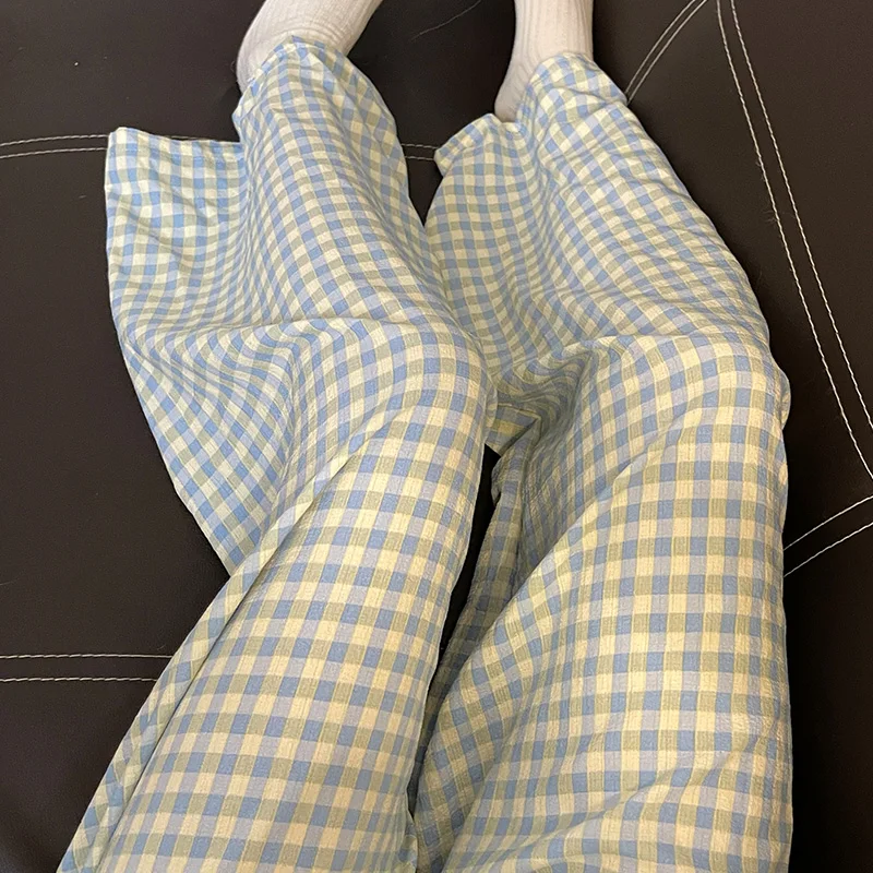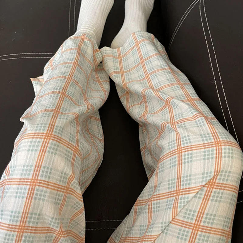 Calças de Pijama Fenas Longas para Mulheres Altas, Estampa Xadrez, Finas, para Casa, Verão, Primavera, Outono, Perna Larg...