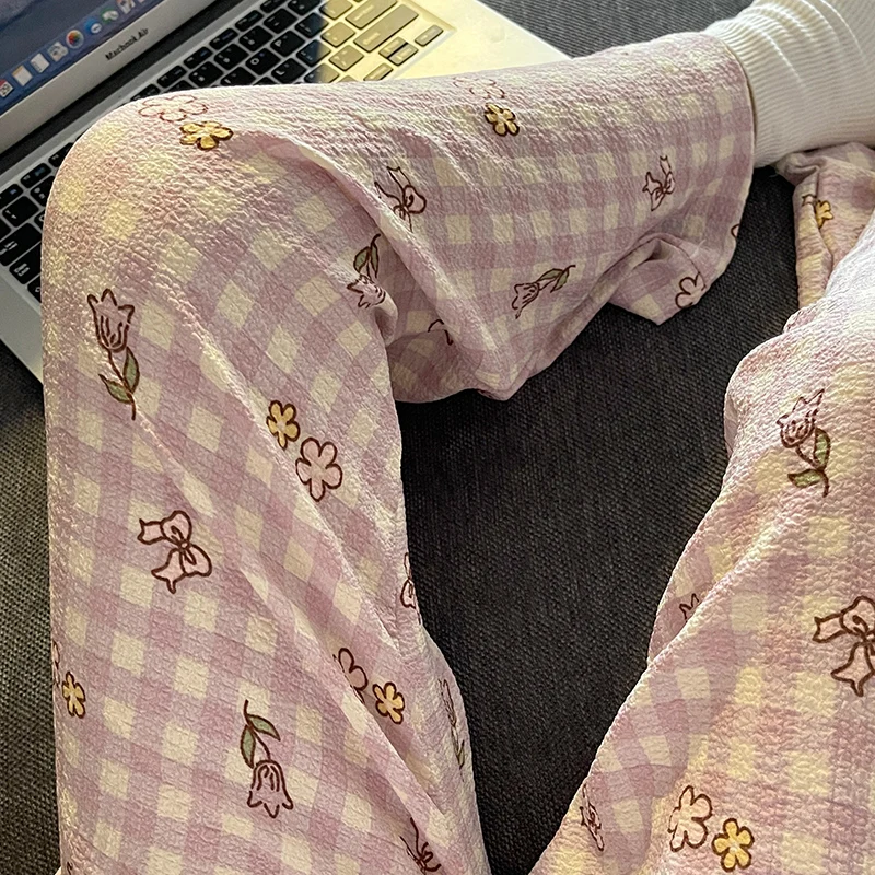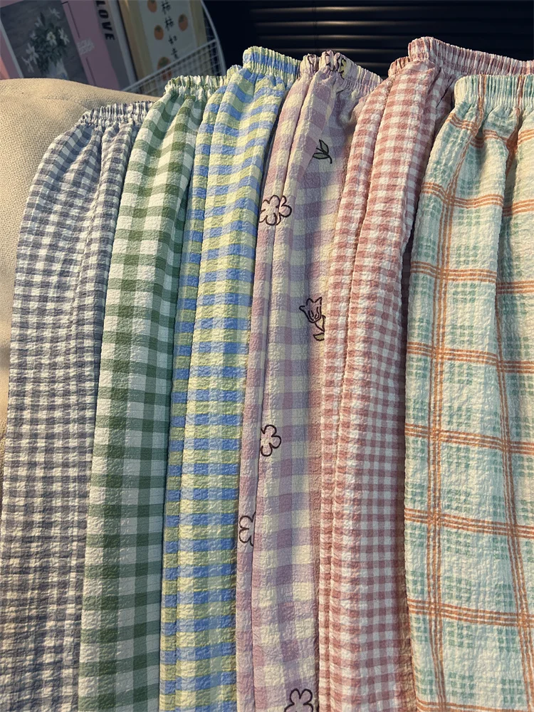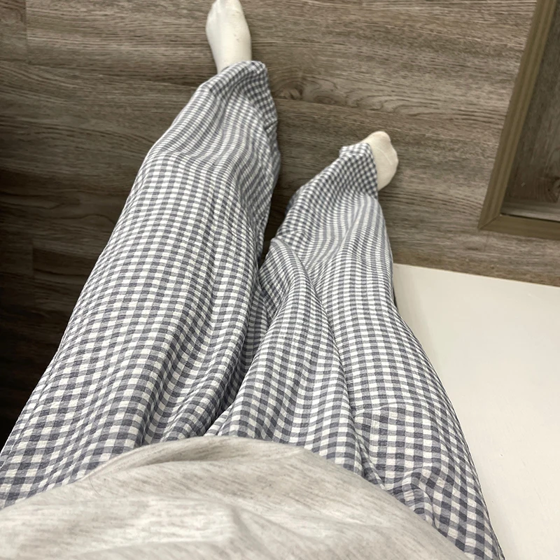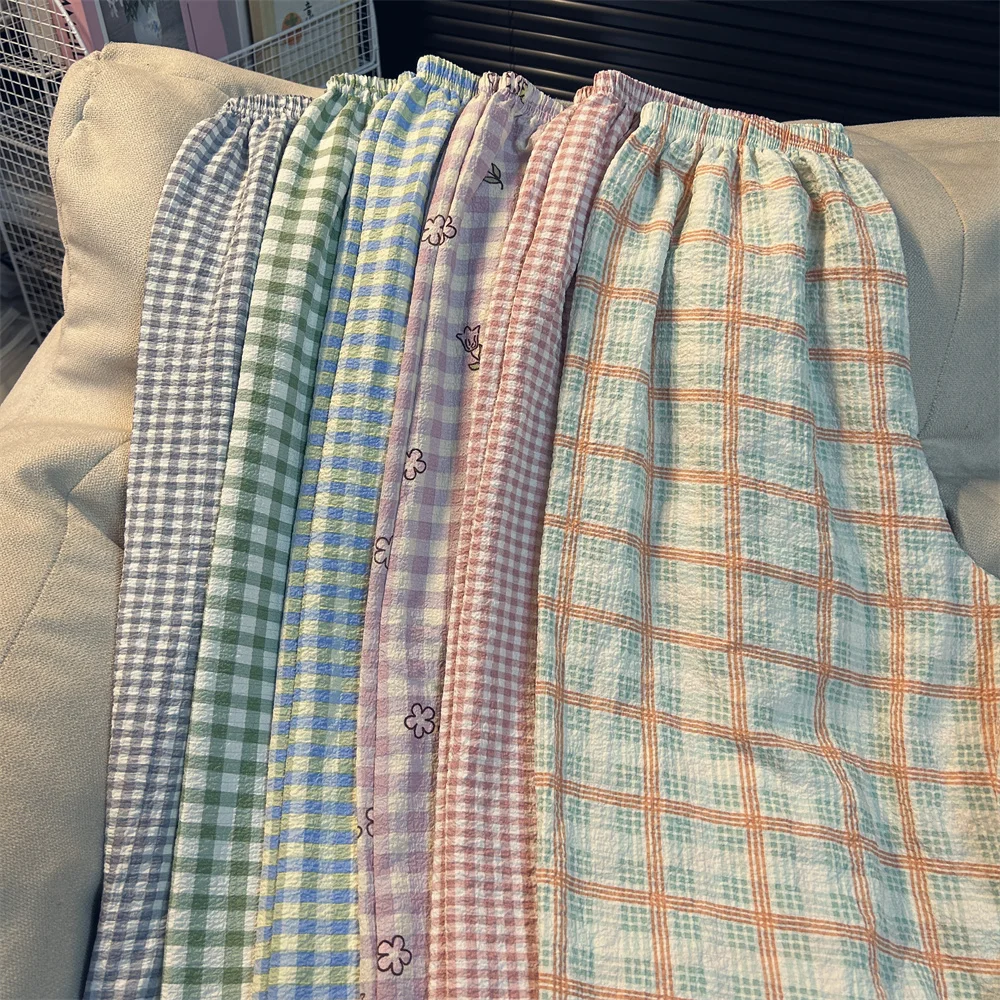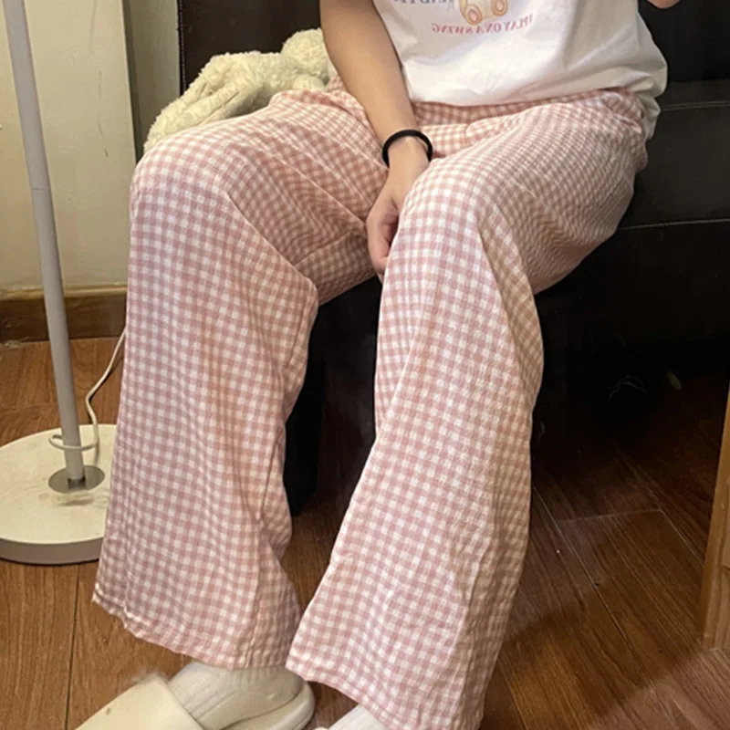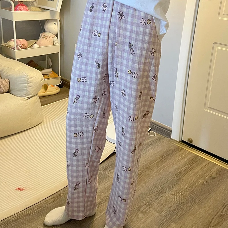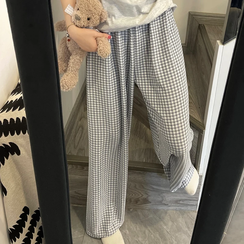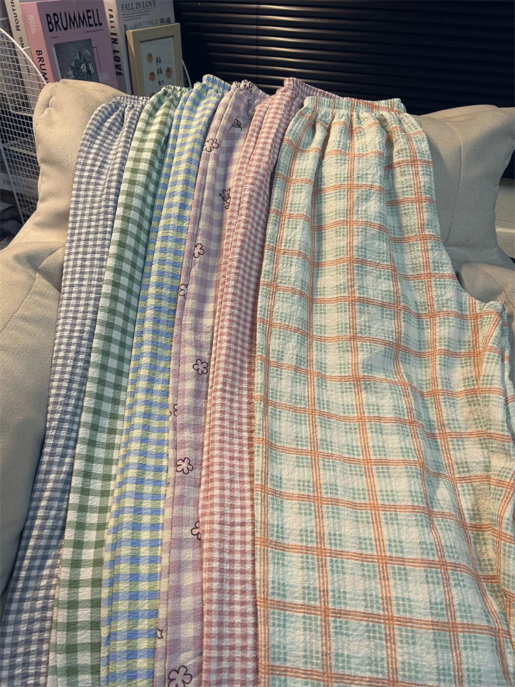 Calças de Pijama Fenas Longas para Mulheres Altas, Estampa Xadrez, Finas, para Casa, Verão, Primavera, Outono, Perna Larg...