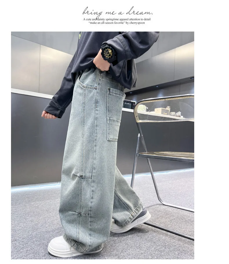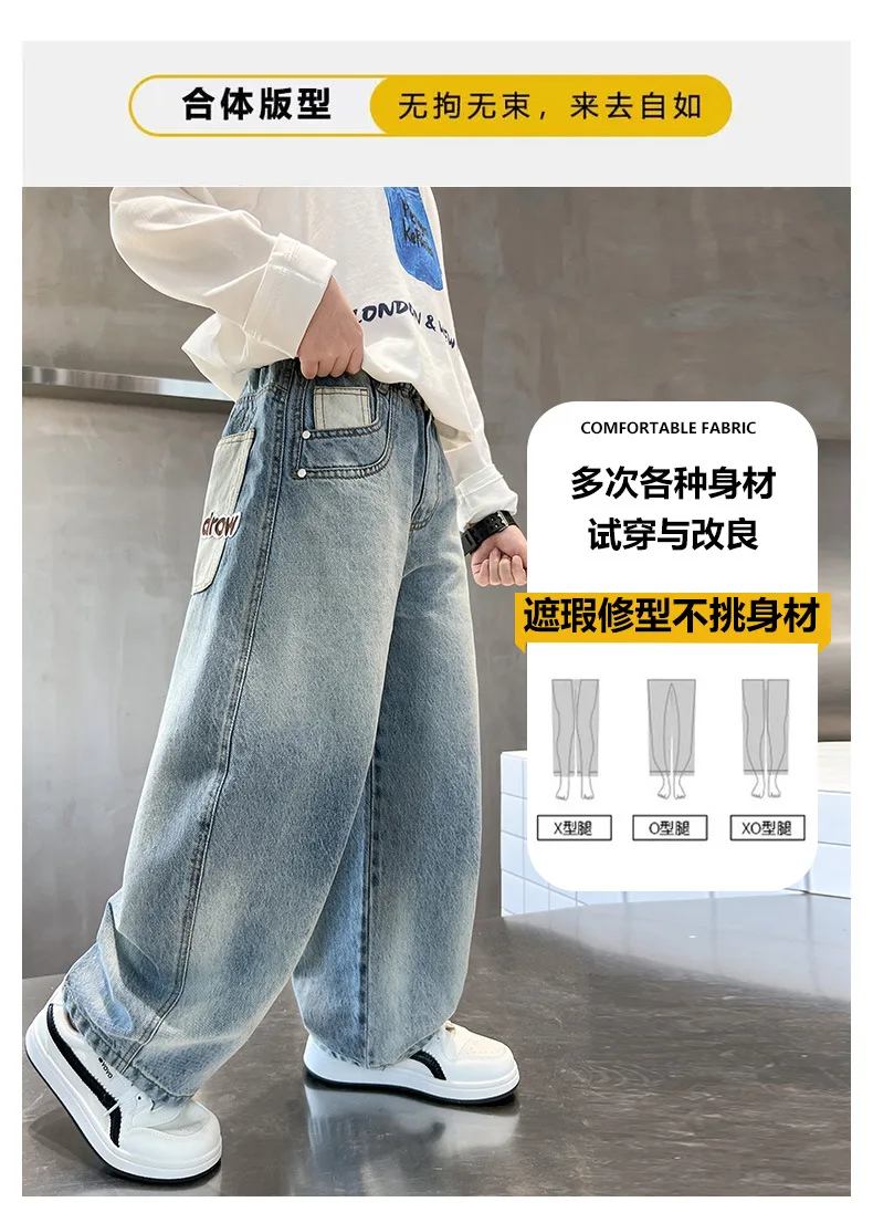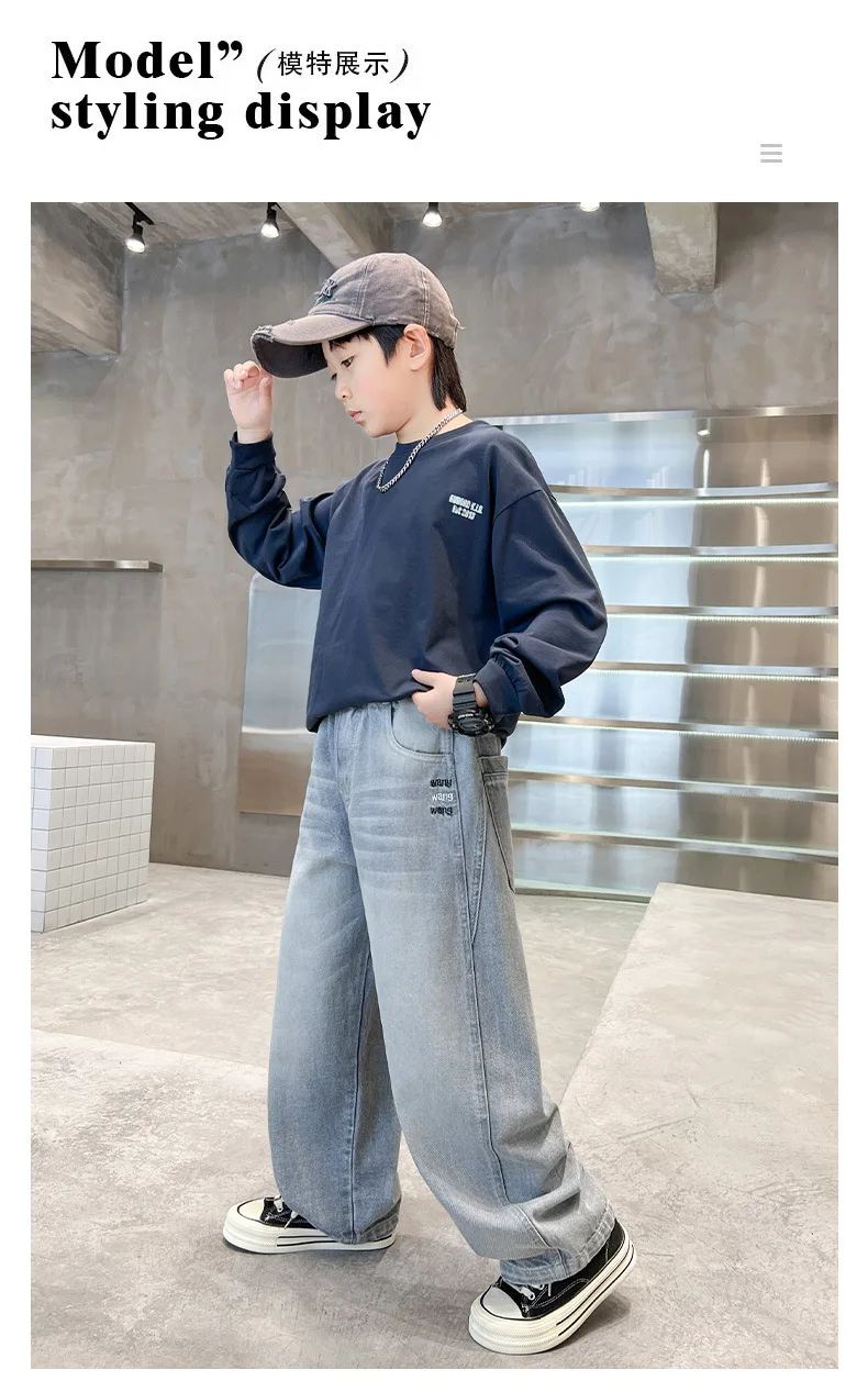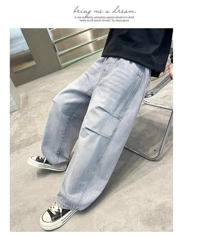 - > Calças Jeans Casuais para Meninos Moda Primavera Calças Confortáveis para Crianças Roupas Largas para Adolescentes Moda Streetwear Infantil