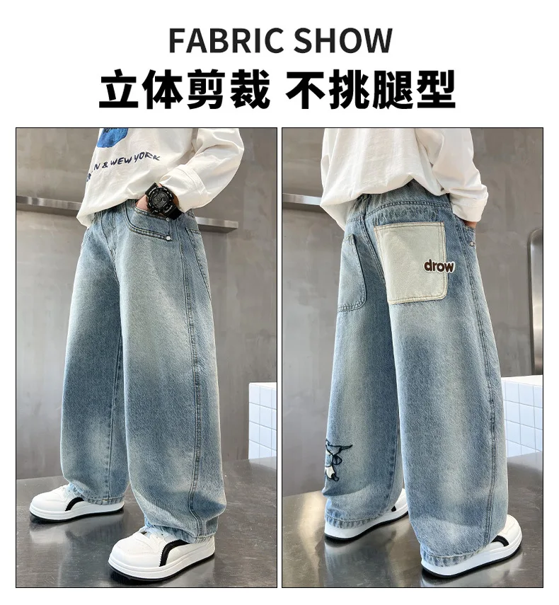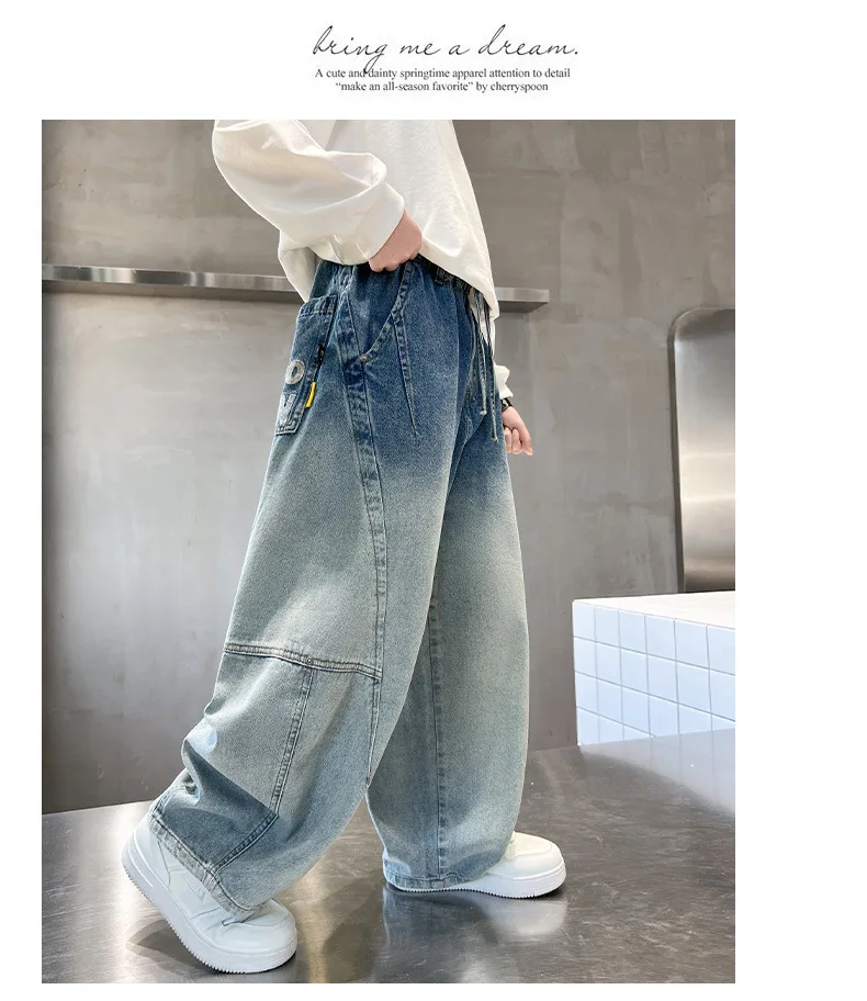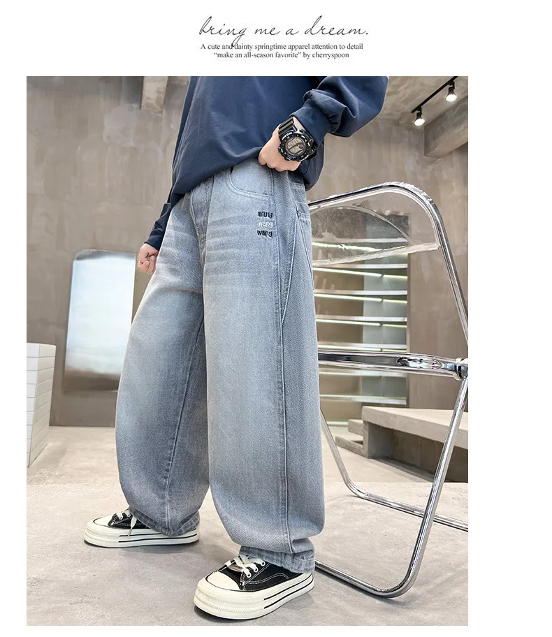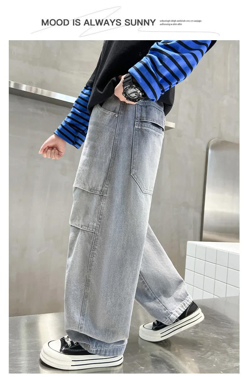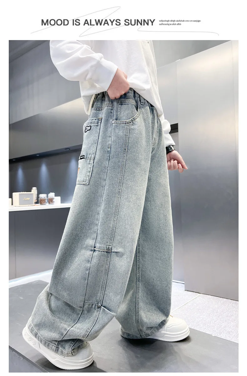 - > Calças Jeans Casuais para Meninos Moda Primavera Calças Confortáveis para Crianças Roupas Largas para Adolescentes Moda Streetwear Infantil