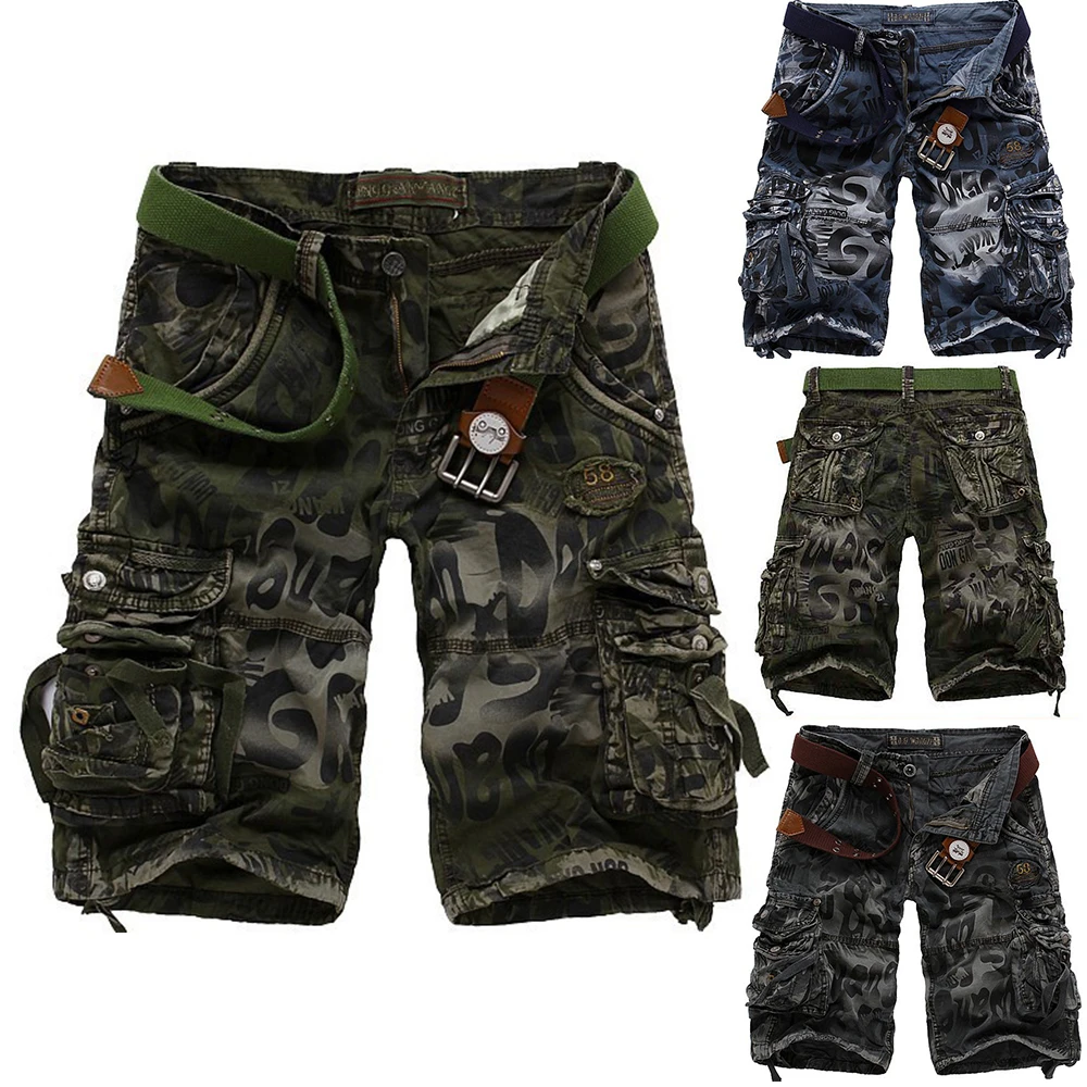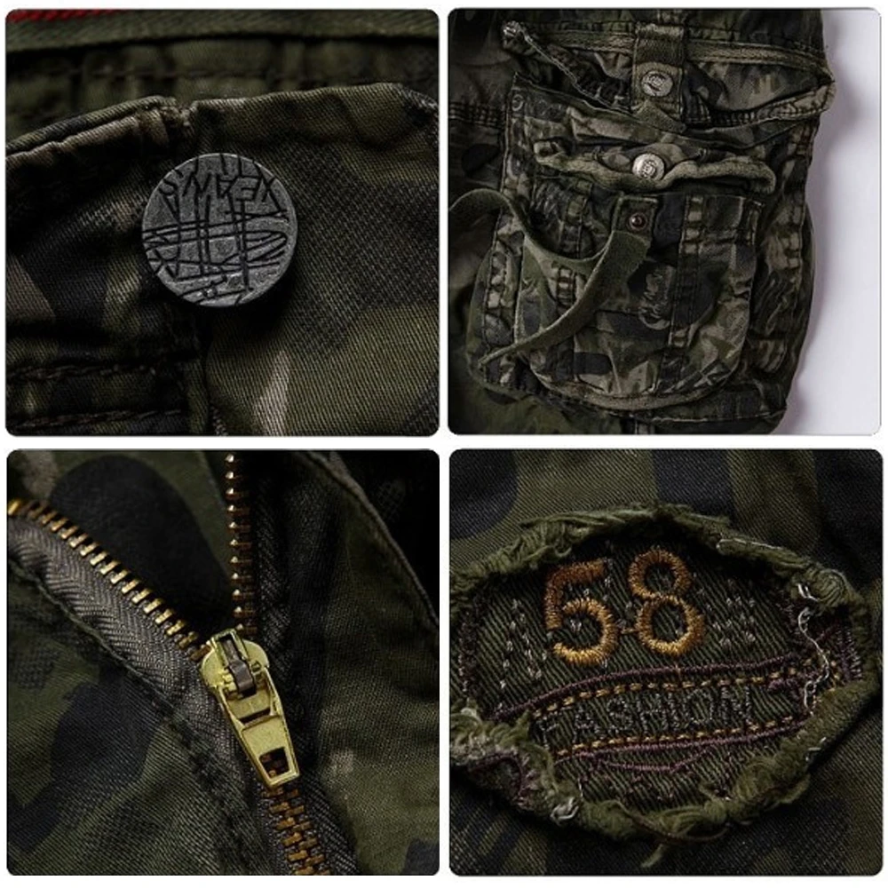 - > Calções de trabalho estampados com camuflagem masculina, bolso múltiplo, com zíper, botão, combate militar, diário, casual, rua, verão