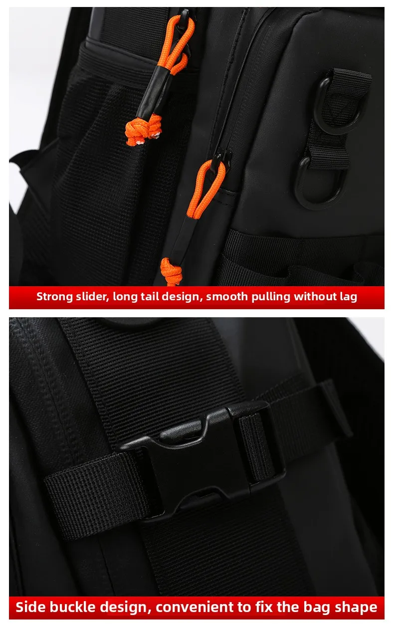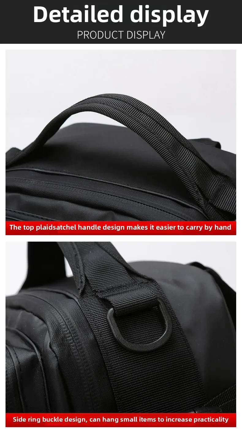1.Configuração de bolsa principal de grande capacidade, o corpo da bolsa configura uma série de bolsos laterais com zíper, design de bolso lateral de malha, armazenamento de zoneamento