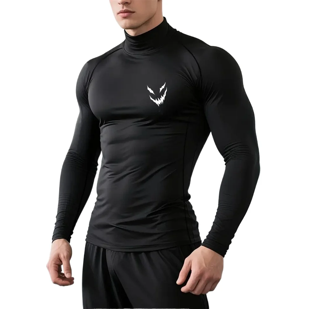 Camisa de compressão masculina com estampa sorridente, secagem rápida, academia, treino, respirável, estiramento, top justo, gola alta, camiseta esportiva