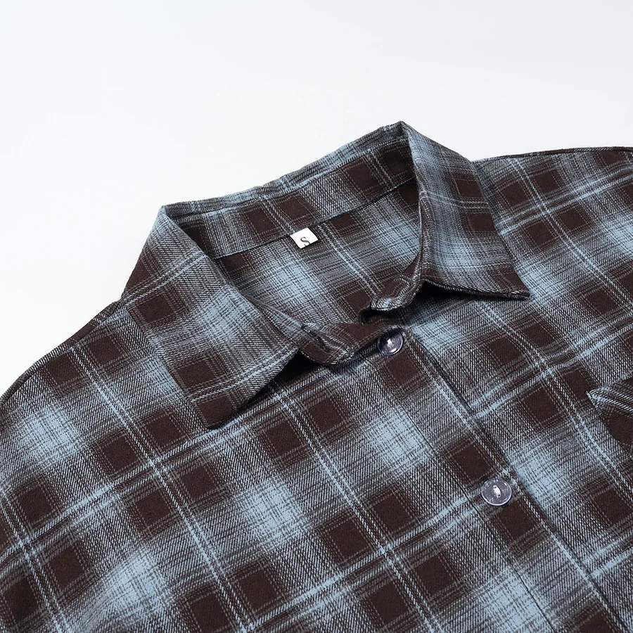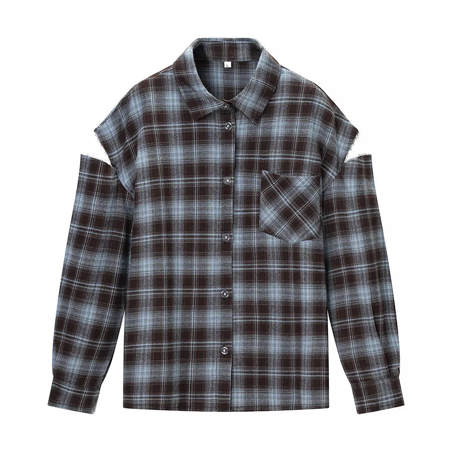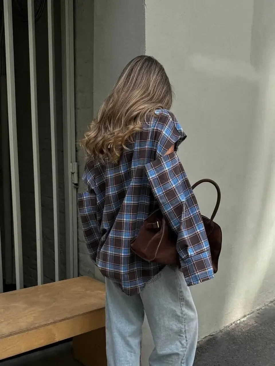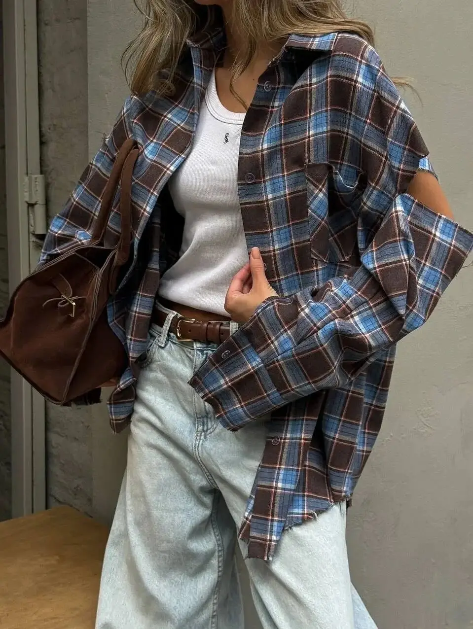 Camisa Feminina Elegante com Estampa Xadrez, Gola Lapela, Manga Longa, Abotoamento Simples, Bolso, Blusa Solta, Nova Coleção 2026, Camisa Estilo Sobretudo Chique