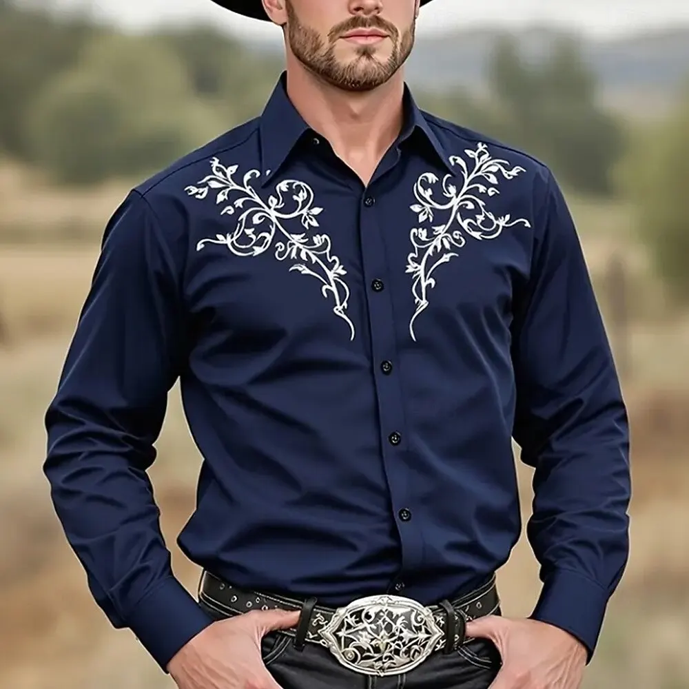 - > Camisa masculina com estampa floral étnica scrollwork camisa ocidental camisa de cowboy manga longa vintage retro férias ao ar livre primavera outono