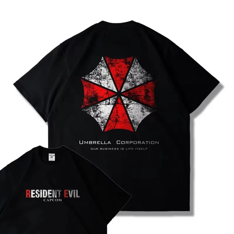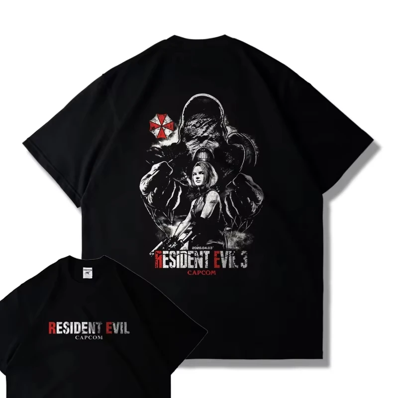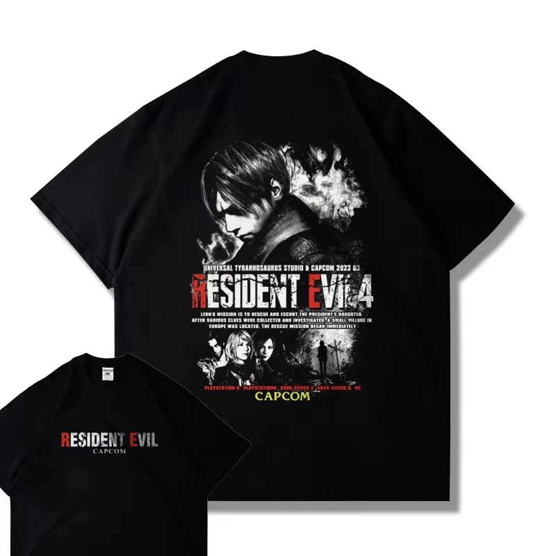 - > Capcom jogo ps5 resident evil 4 remasterizado manga curta camiseta masculina e feminina roupas soltas leon impresso harajuku y2k topo