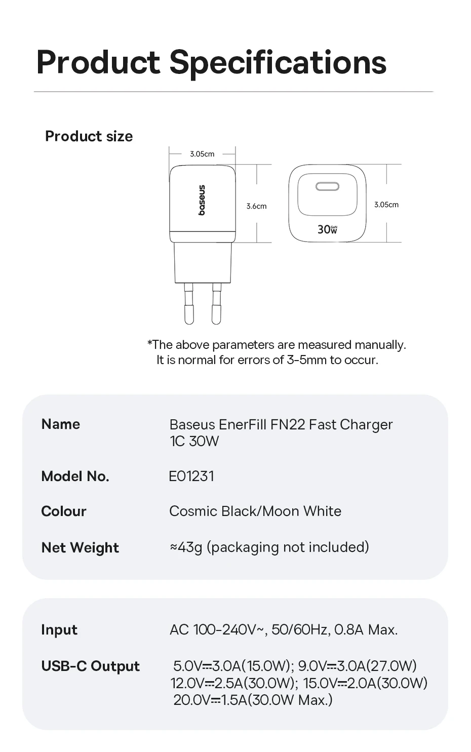 Saída Tipo-C: 5V/3A (15W), 9V/3A (27W), 12V/2.5A (30W), 15V/2A (30W), 20V/1.5A (30W) Máx.