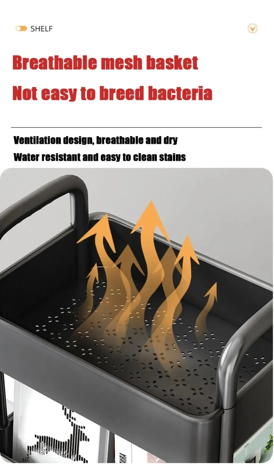 1. Esta prateleira de armazenamento adota um fundo oco em tela, dizendo adeus ao acúmulo de água estagnada durante o uso. Possui grande capacidade e design de múltiplos níveis que permite armazenar frutas, lanches, condimentos, panelas e frigideiras, produtos de banheiro, etc.
