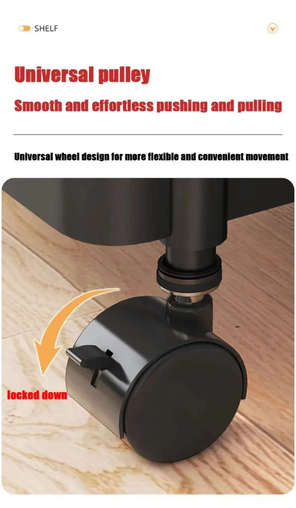 4. Rodas universais com freio: 4 rodas duráveis e de fácil deslizamento permitem que o carrinho de armazenamento deslize para qualquer lugar para uso conveniente.