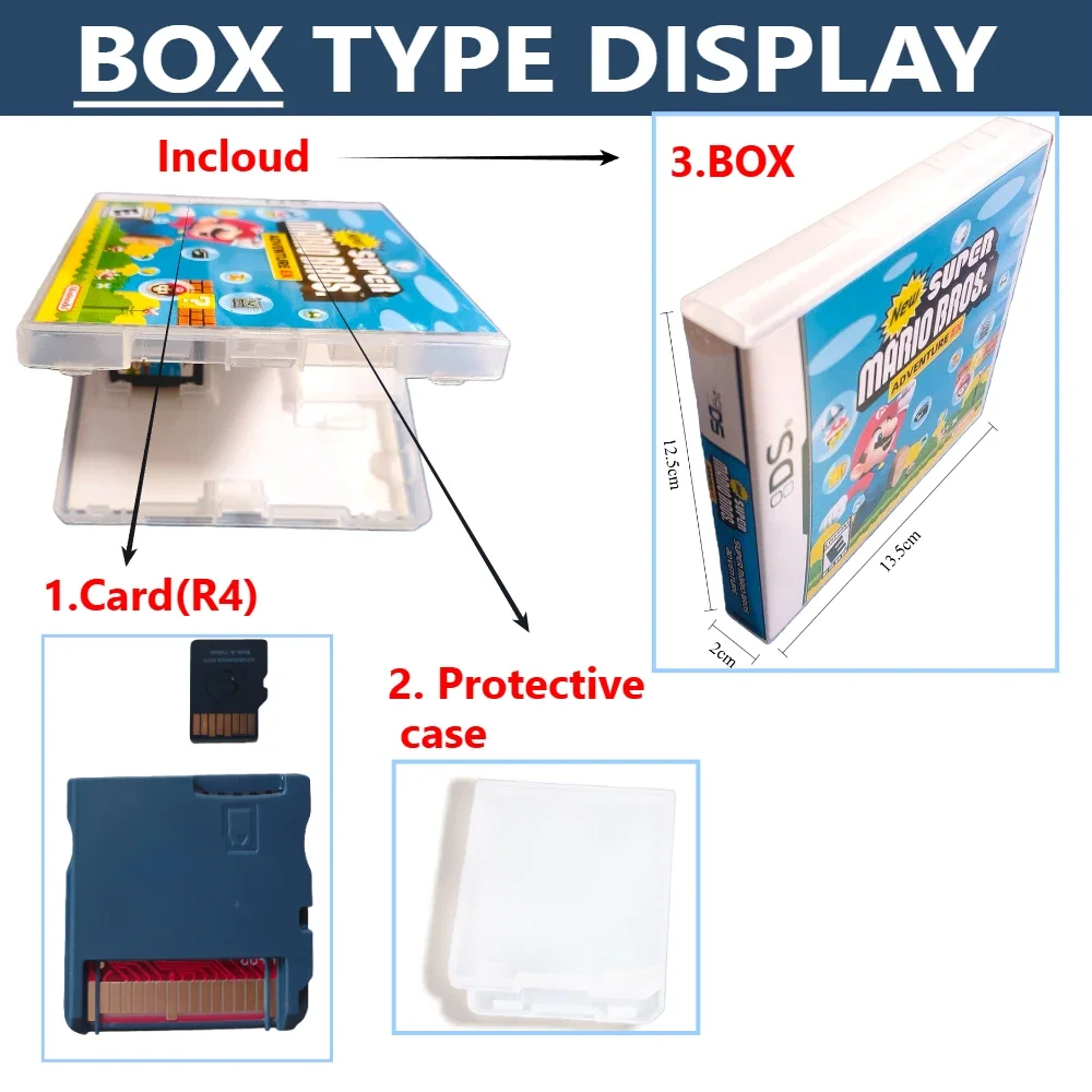 TIPO DE CAJAVersão de EE.UU.: Idioma inglês (Historia/Parceles del navegador Mario Luigi dentro del tempo, Mario Party DS,Mario Bros/Adventure EX,Super Mario 64 DS,Mairo Hoops 3on3,Mario vs Donkey Kong2) você veja os detalhes da peça.