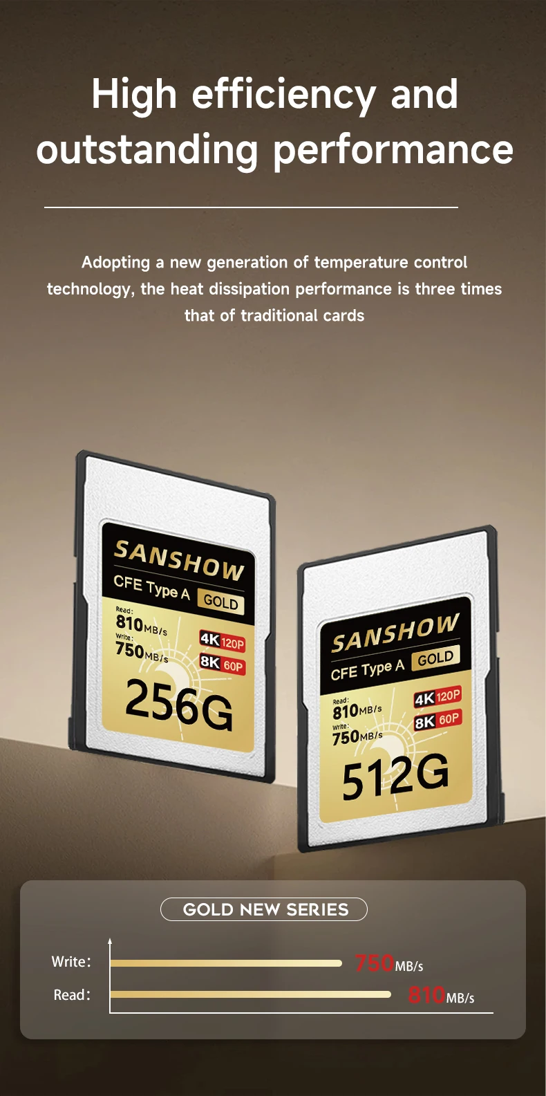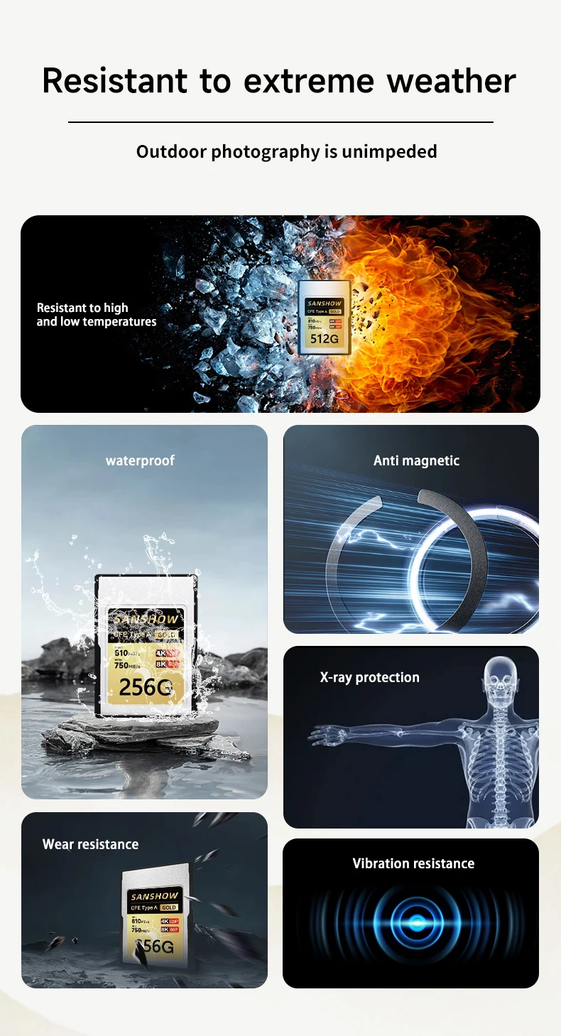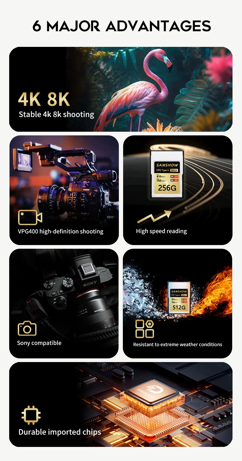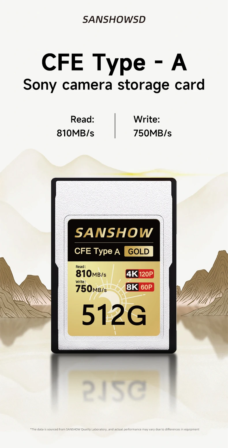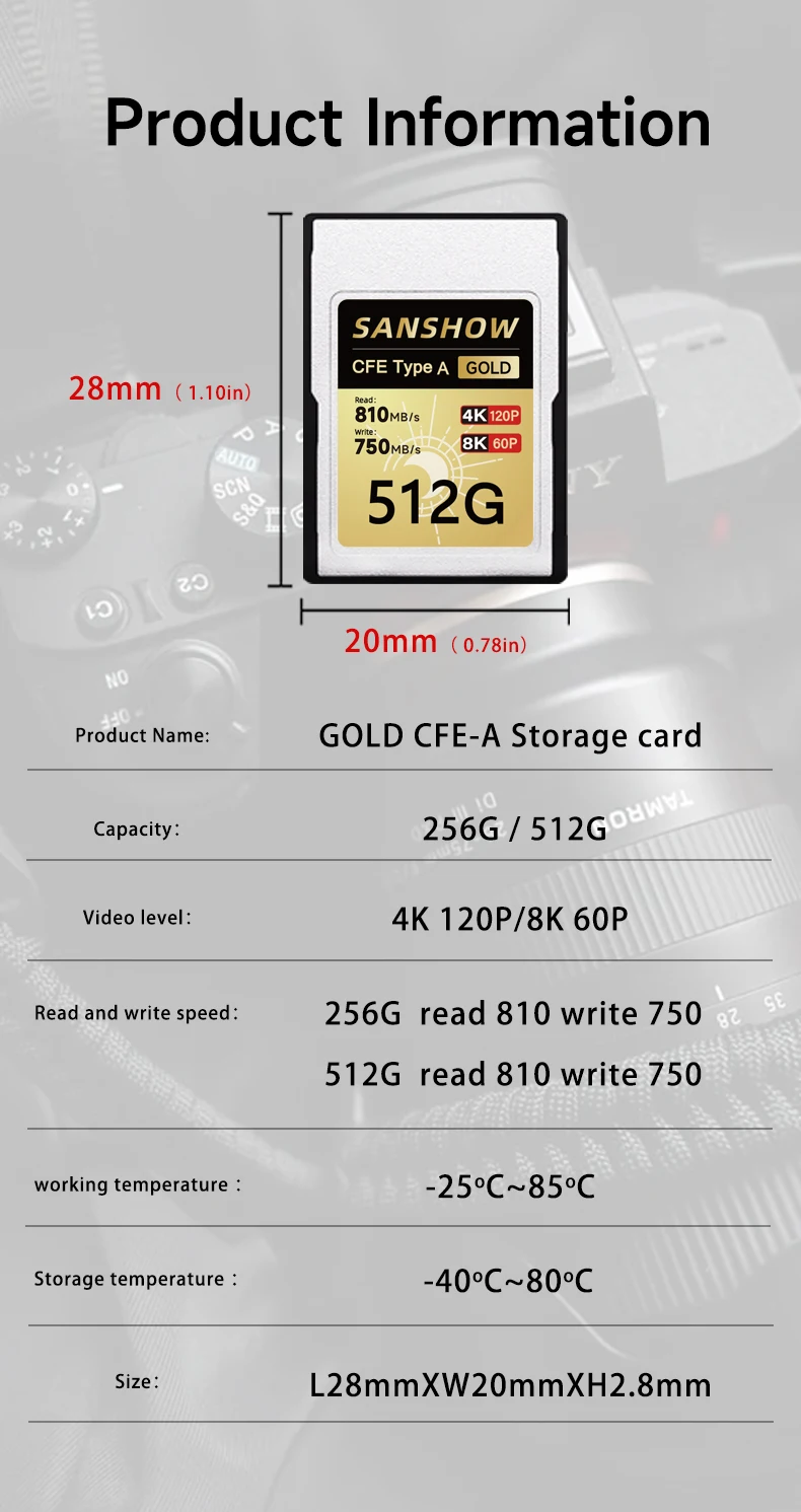- > Cartão de memória CFexpress Tipo A, até 810 MB/s Velocidade de leitura 750 MB/s Velocidade de gravação para 4K 120P, 8K 30P Gravação de vídeo/foto, compatível