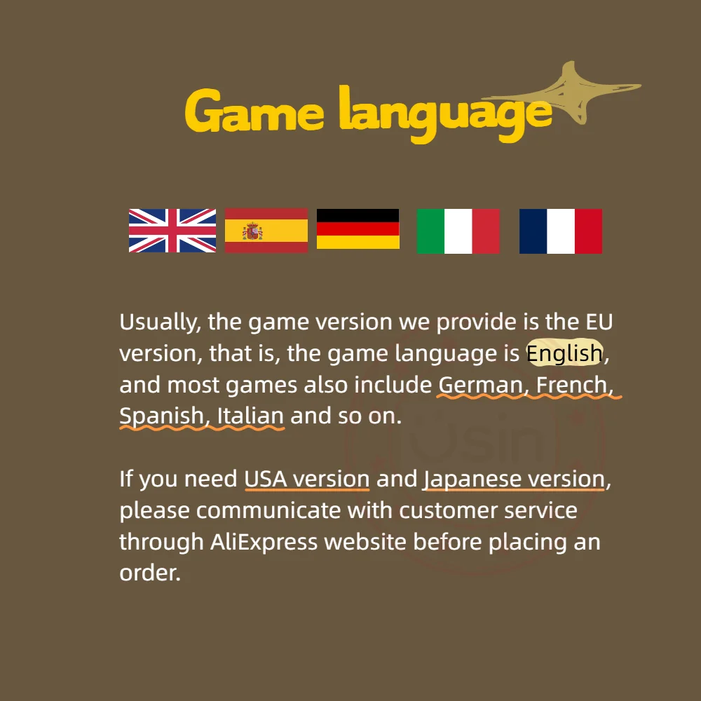 Normalmente, a versão do jogo que fornecemos é a versão da UE, ou seja, o idioma do jogo é o inglês, e a maioria dos jogos também inclui alemão, francês, espanhol, italiano e assim por diante.