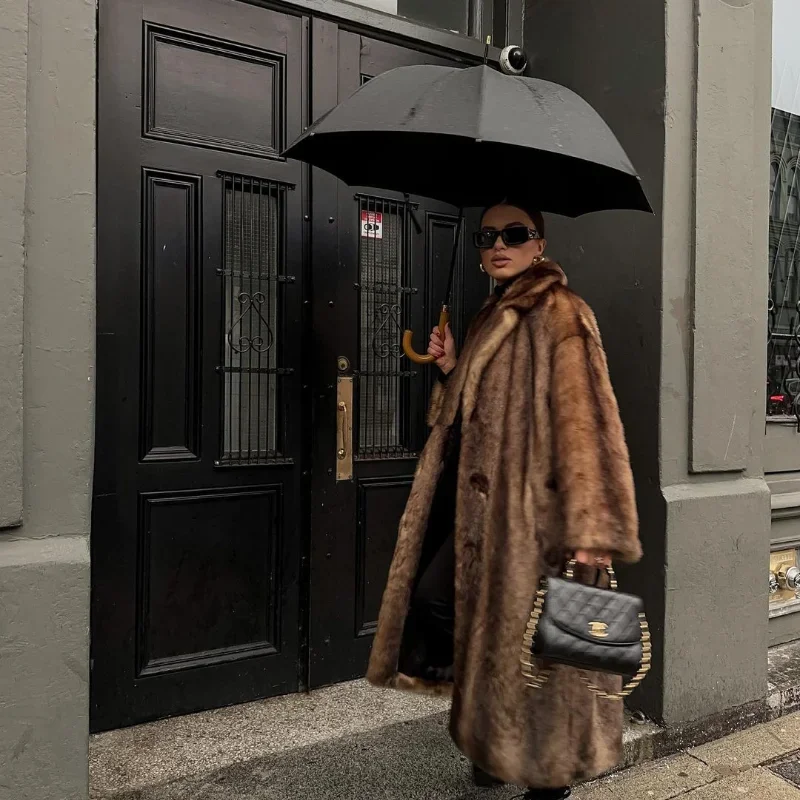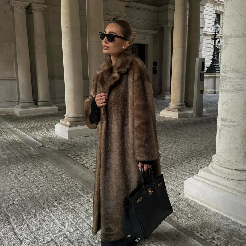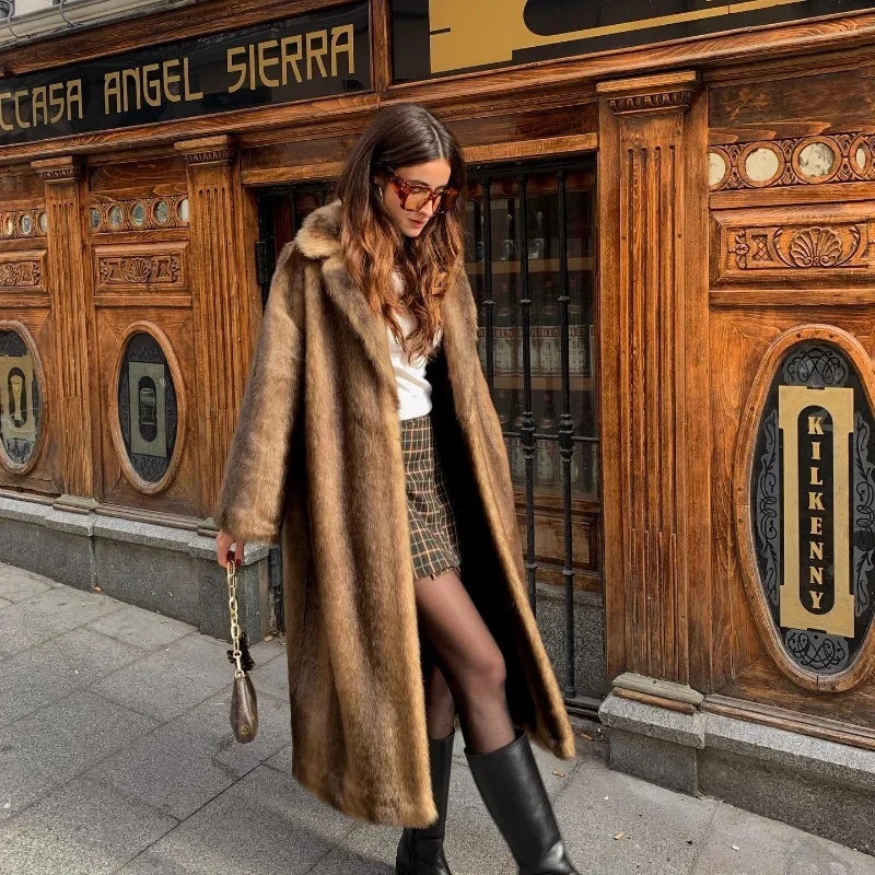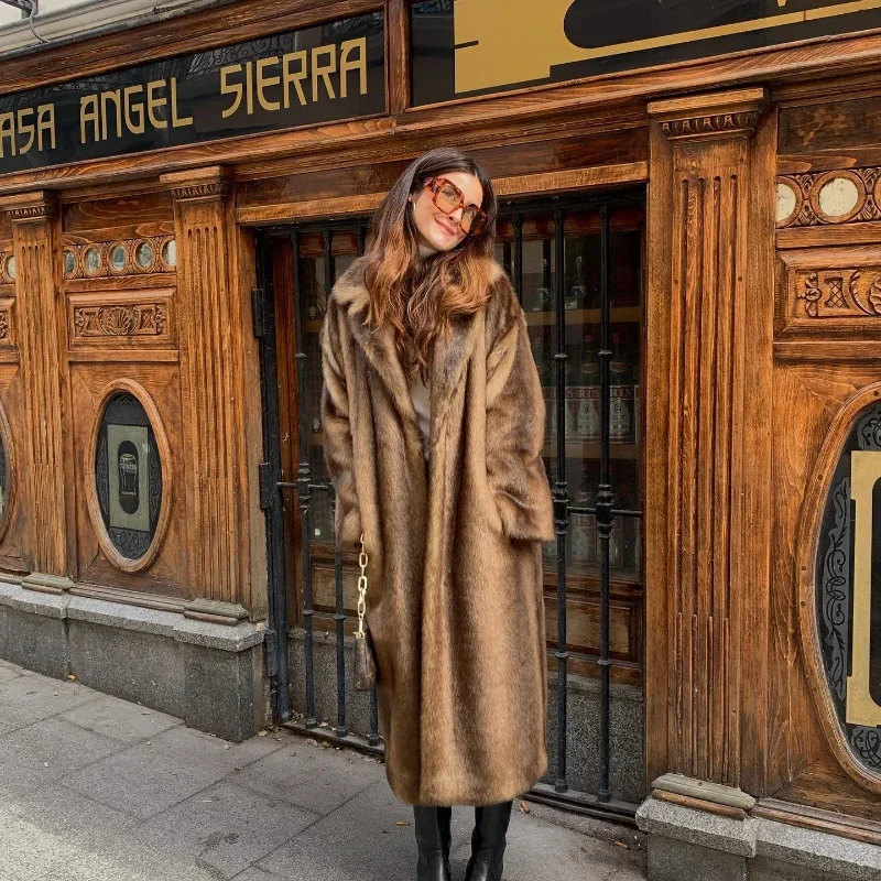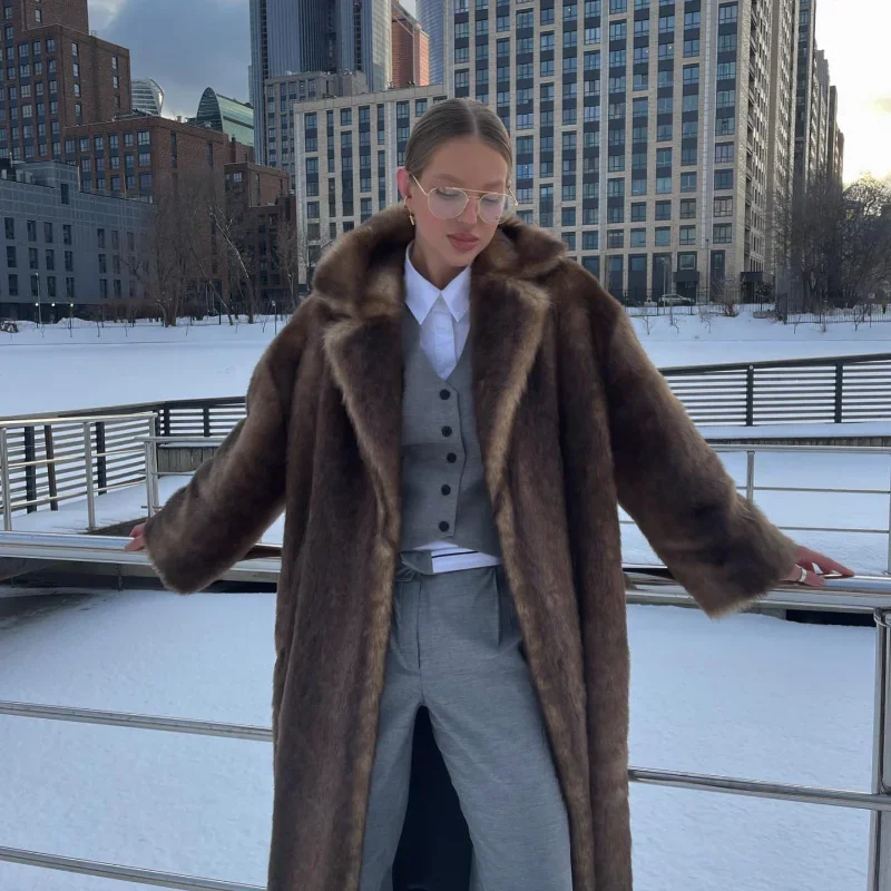 Casaco de lã de peito único feminino, sobretudo longo de peles artificiais, casaco de pelúcia quente, marrom escuro, inverno, novo, 2023
