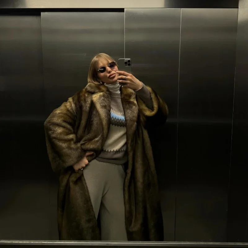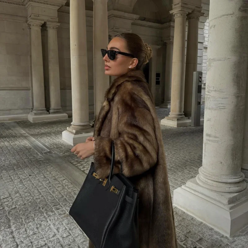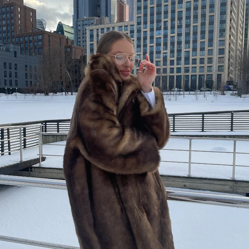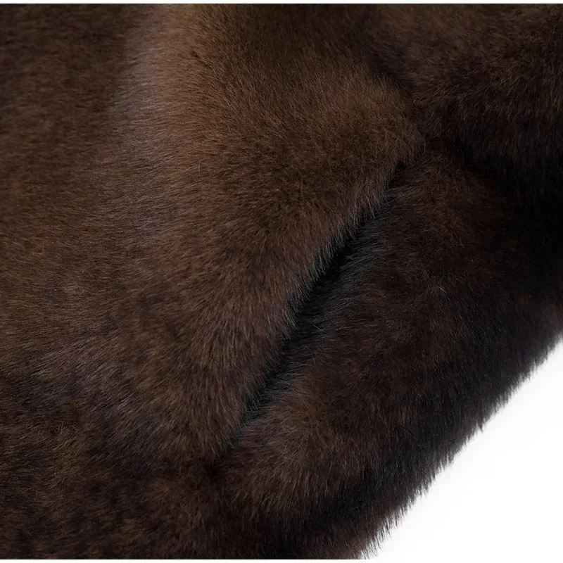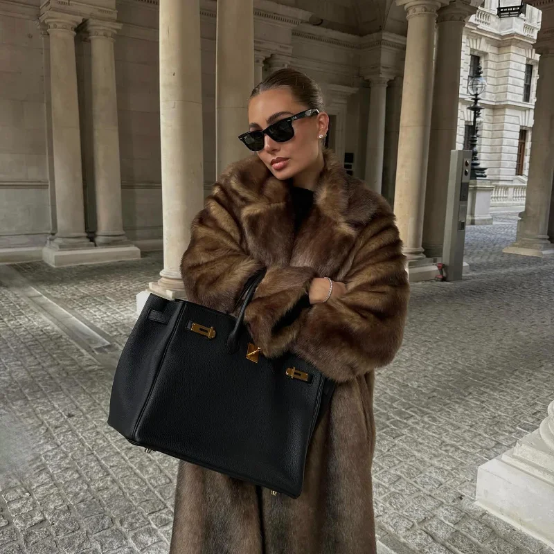 Casaco de lã de peito único feminino, sobretudo longo de peles artificiais, casaco de pelúcia quente, marrom escuro, inverno, novo, 2023