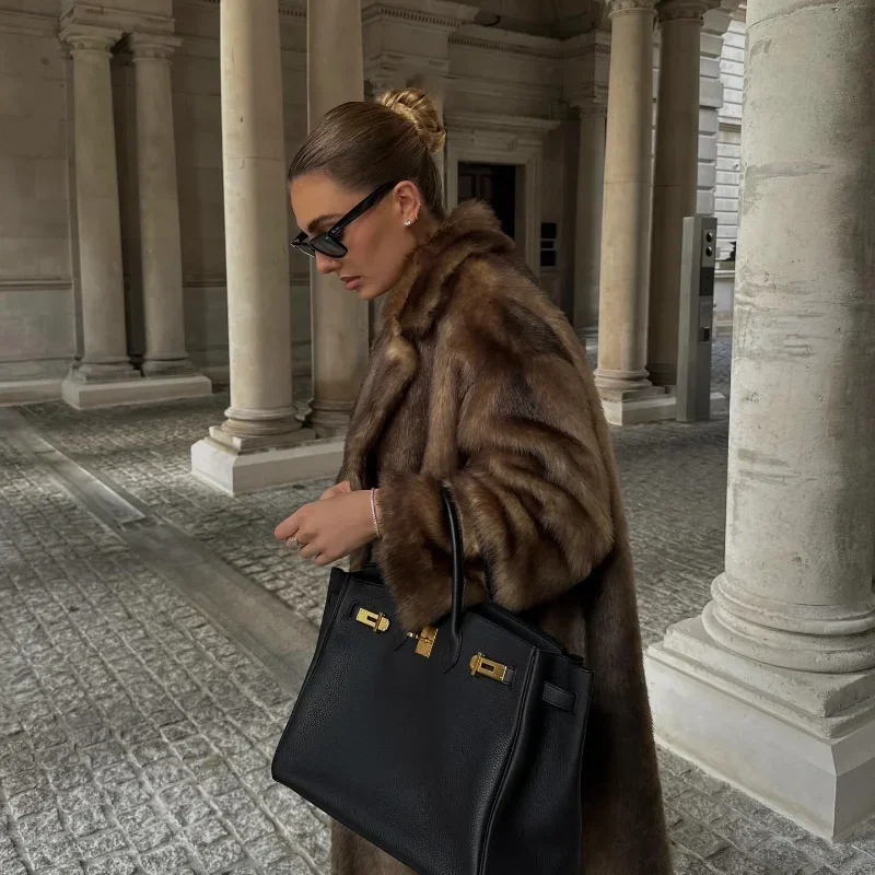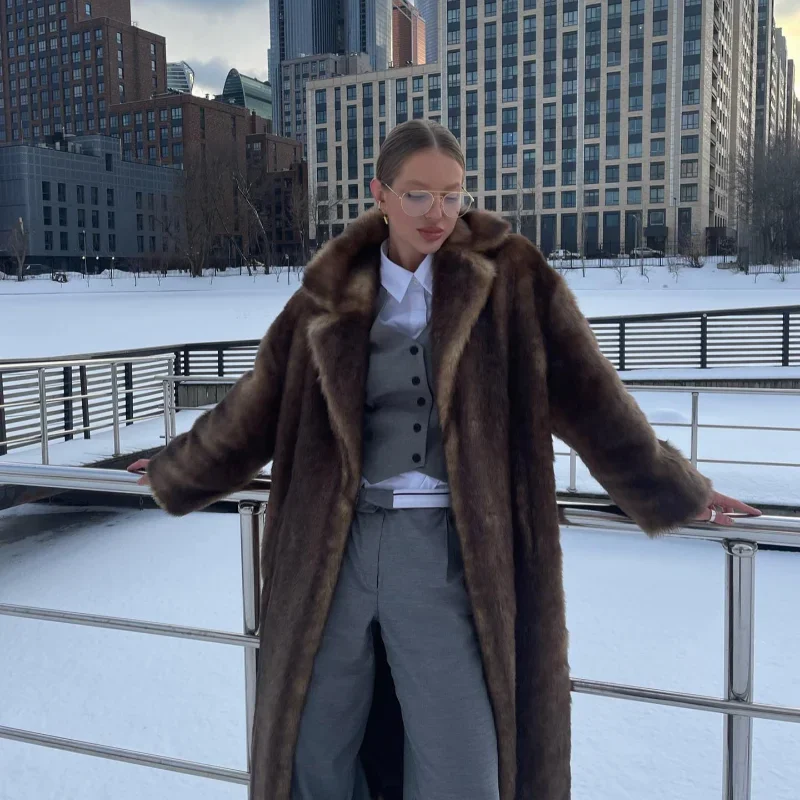 - > Casaco de lã de peito único feminino, sobretudo longo de peles artificiais, casaco de pelúcia quente, marrom escuro, inverno, novo, 2023