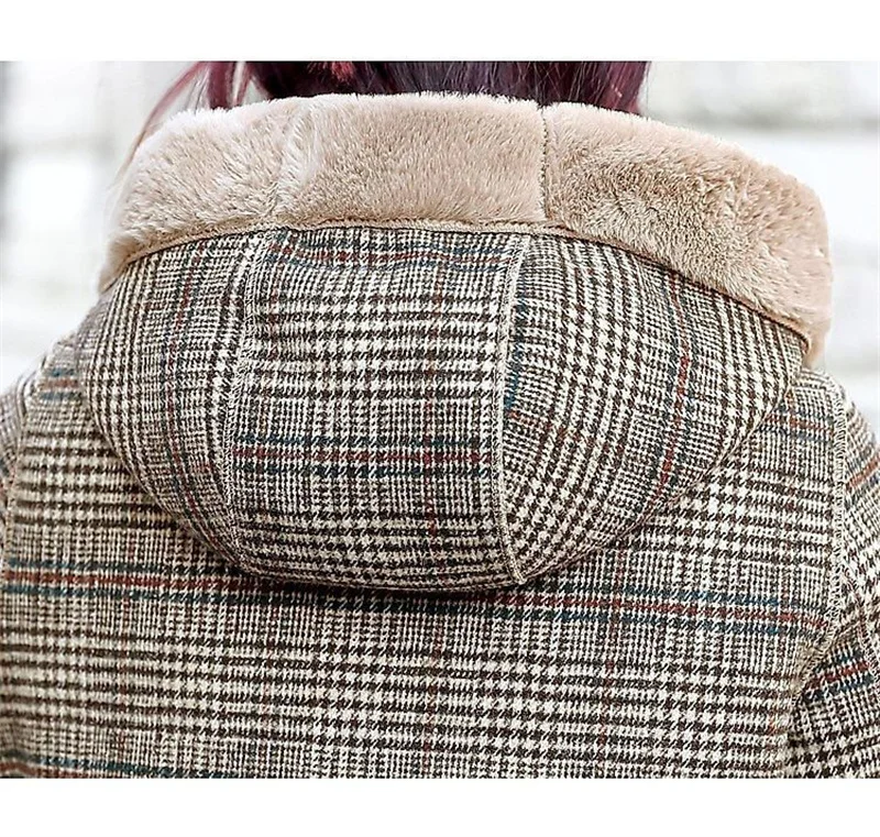- > Casaco de lã xadrez feminino grosso veludo engrossado quente meados de longo jaquetas com capuz casaco de lã quente senhoras jaqueta de inverno casaco de pele do falso