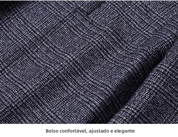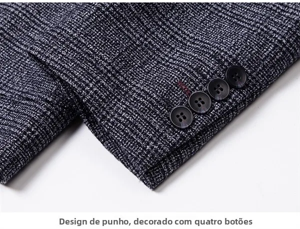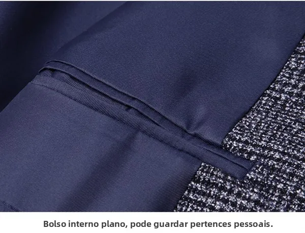 Os detalhes de qualidade, como a costura clara e os bolsos de linha visível, adicionam um toque de sofisticação ao terno.