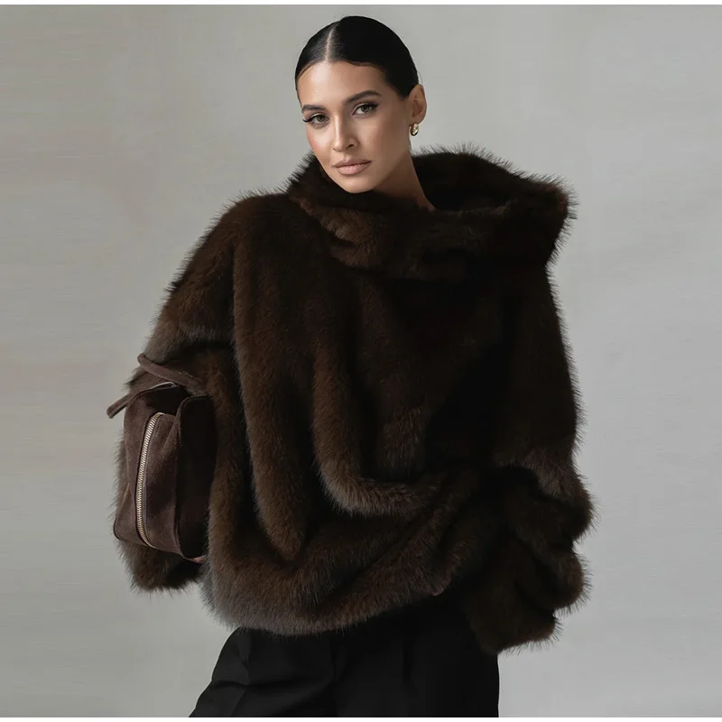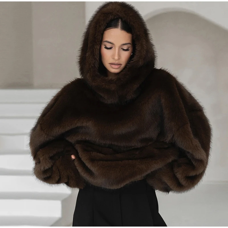 - > Casual peludo com capuz pulôver de pele do falso feminino solto manga cheia quente casaco sólido 2025 outono inverno senhora rua moda outwear novo