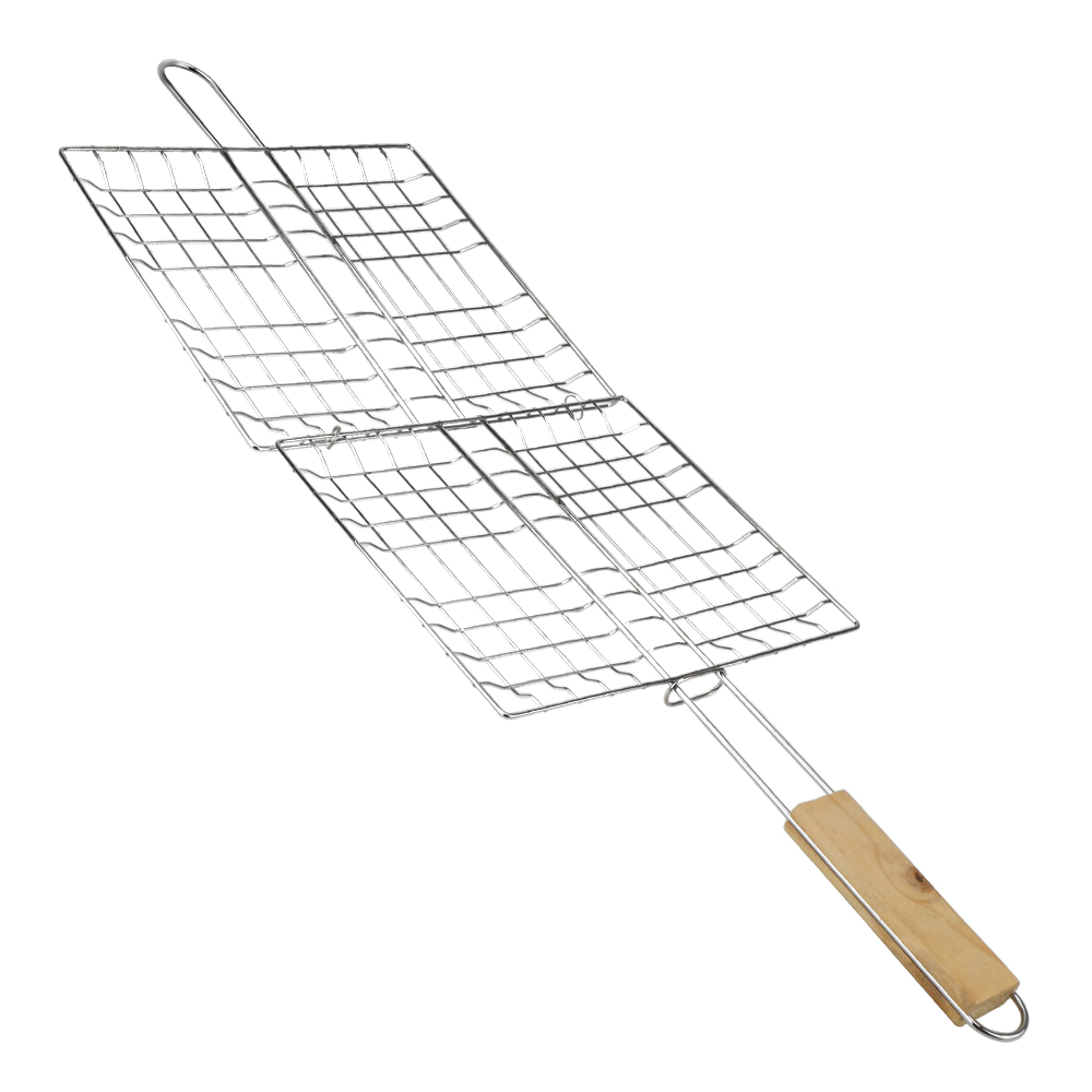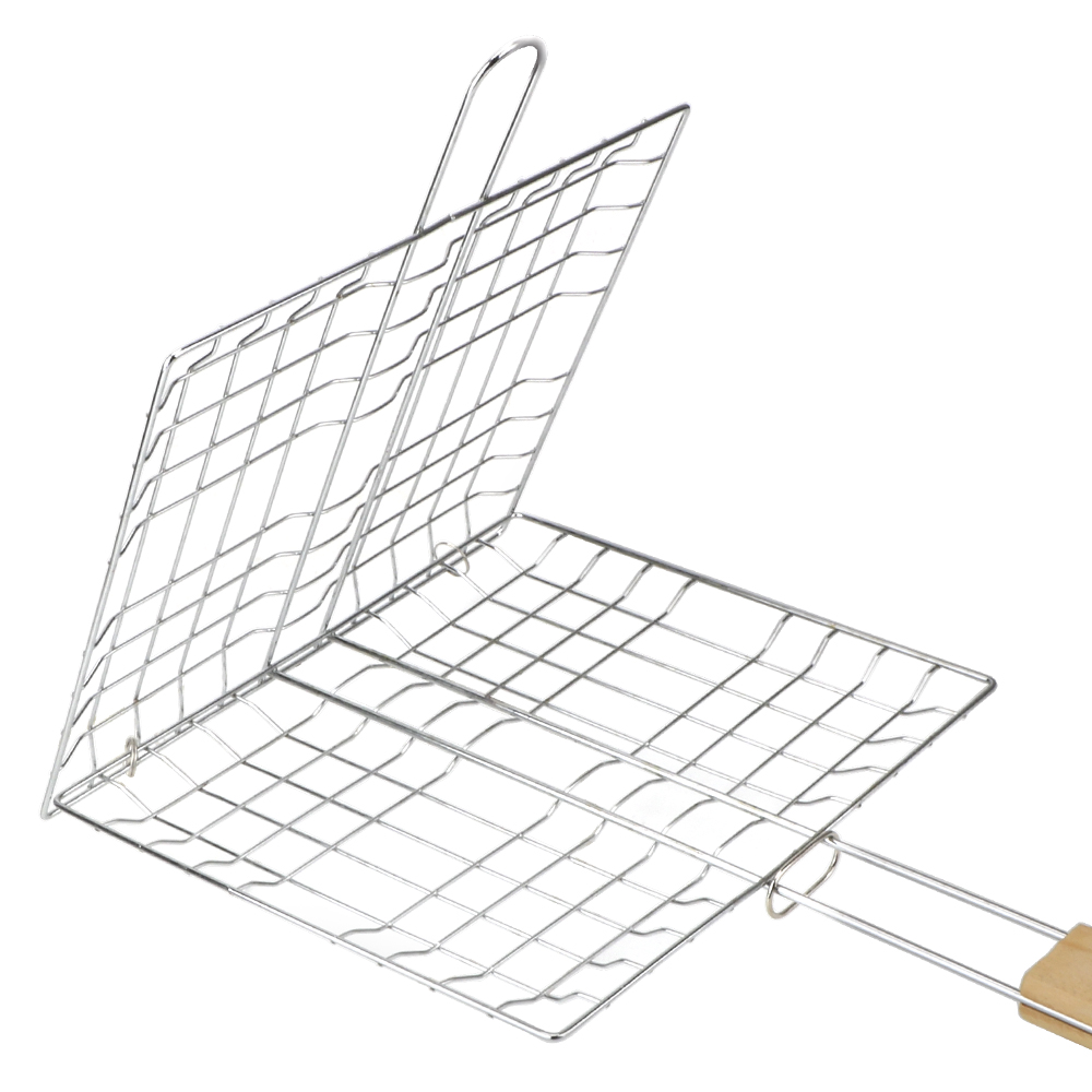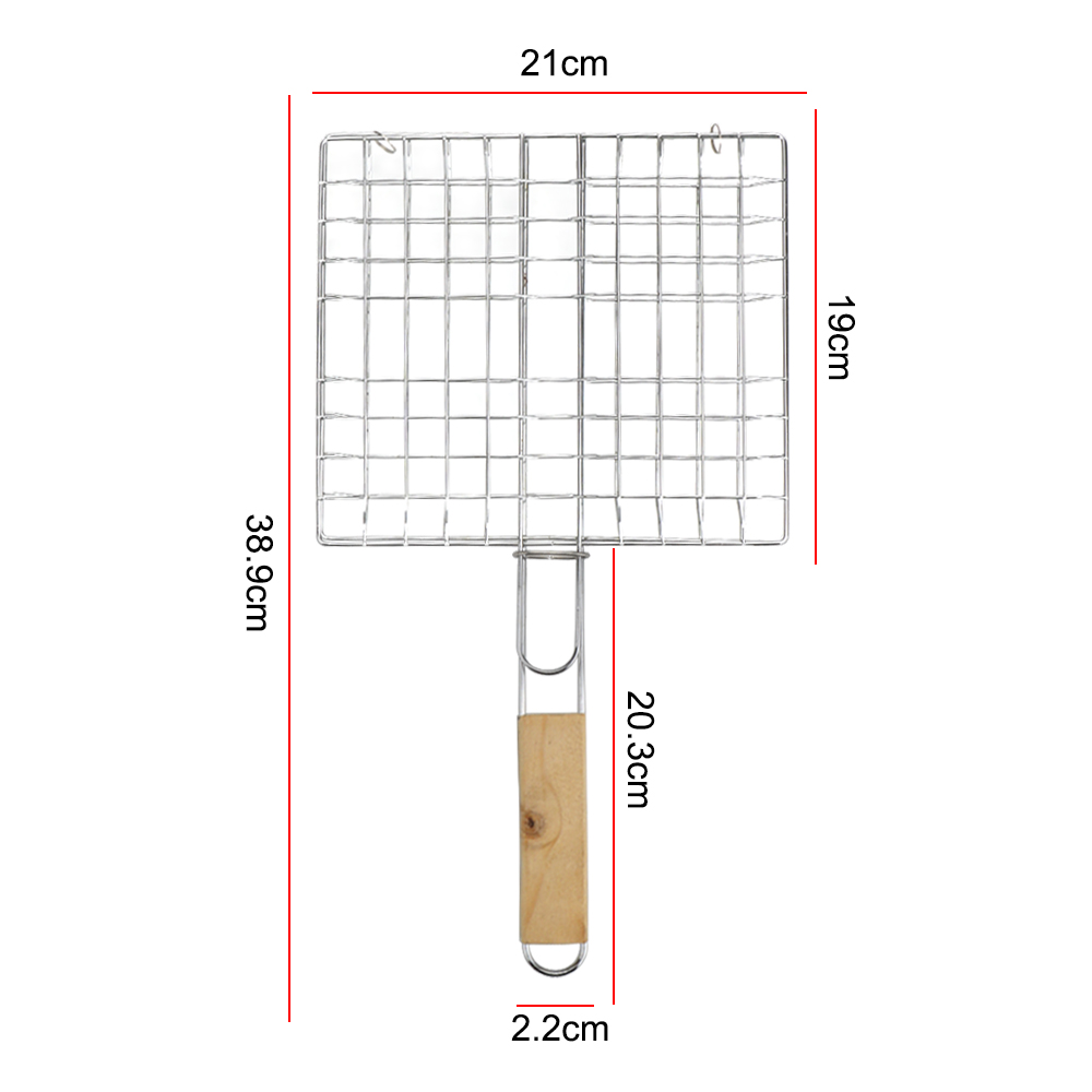 A rede para churrasco é feita de malha de metal de alta qualidade e cabo de madeira.