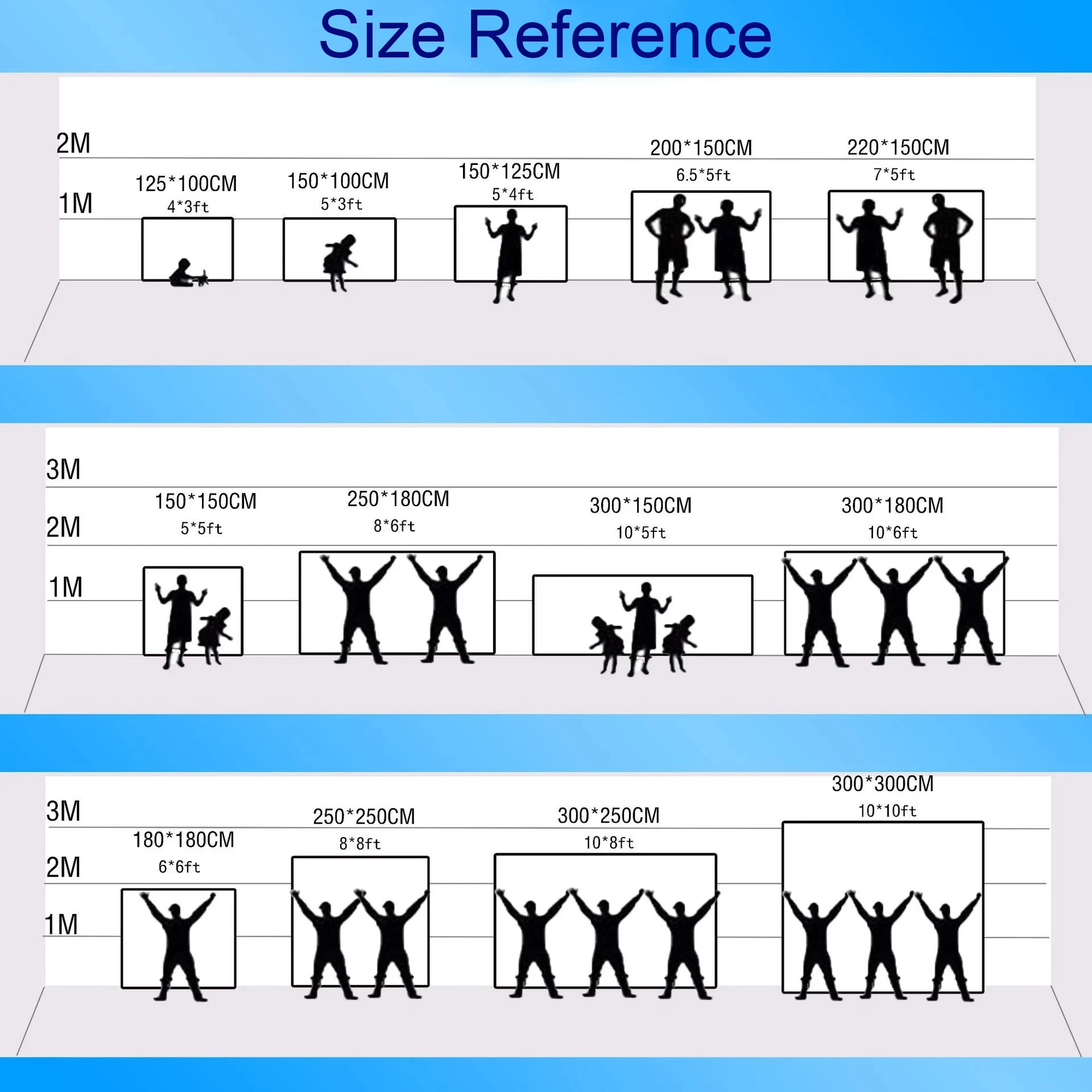 Nosso tamanho é largura x altura, a unidade é cm.Por exemplo, 300x200cm significa 300cm de largura e 200cm de altura.