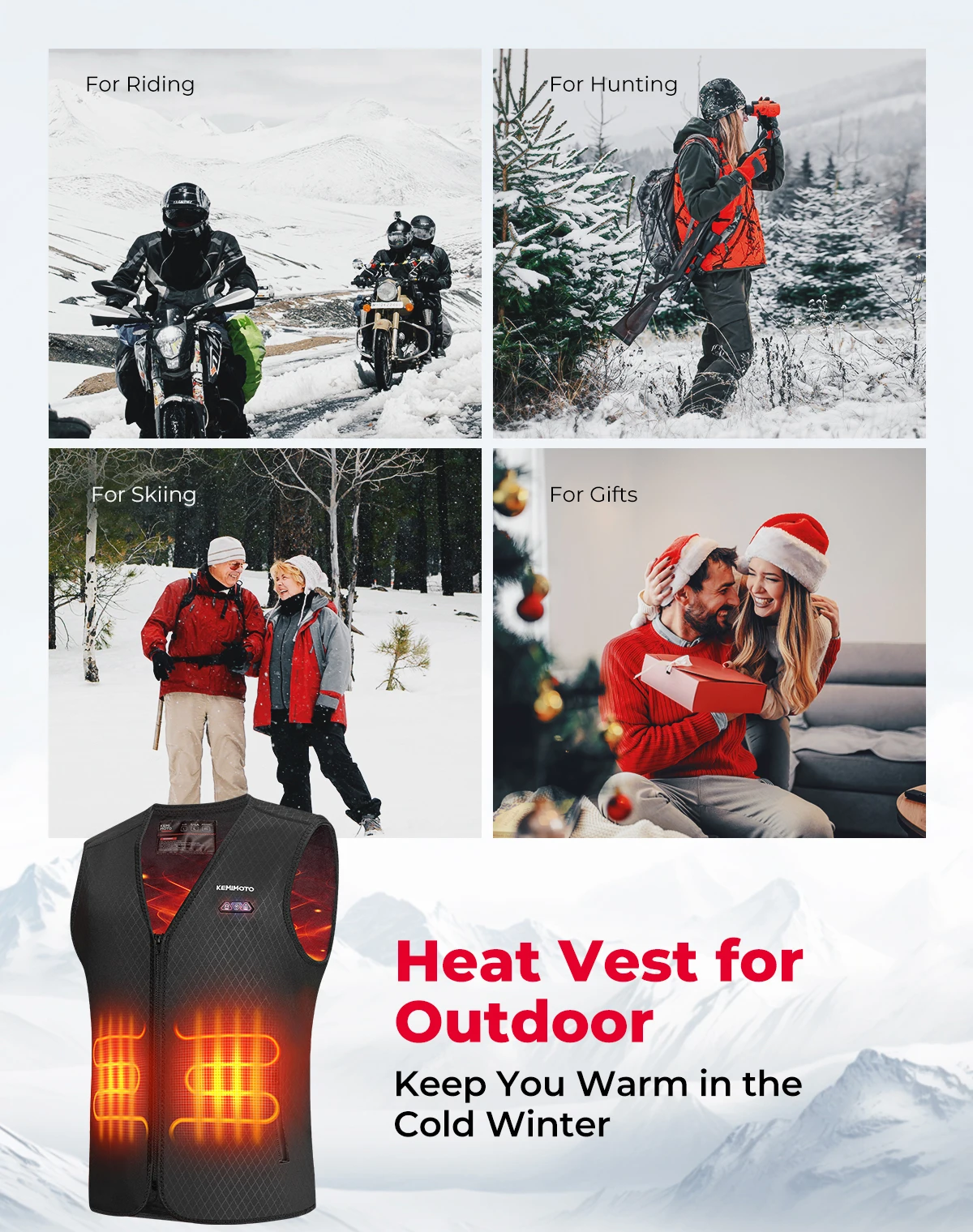 【Presente de inverno perfeito】Este colete aquecido é ideal para esqui, motociclismo, pesca ou outros trabalhos/atividades ao ar livre.É o presente de inverno perfeito para familiares e amigos, ajudando-os a se manter aquecidos e confortáveis durante o tempo frio.