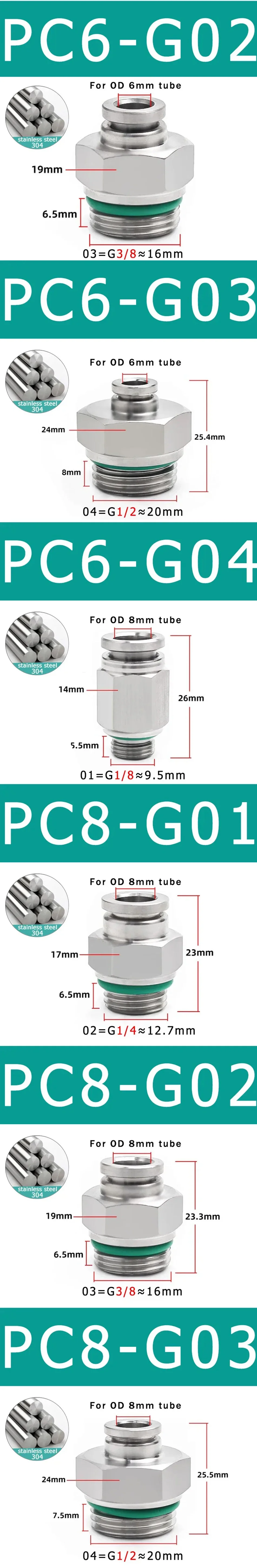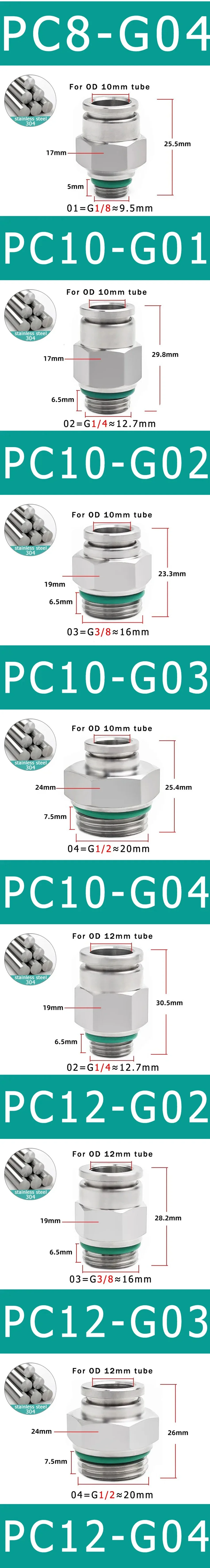 Conector rápido pneumático para pc, aço inoxidável 304, rosca g m5 m6 1/8 "1/4" 3/8 "1/2" bsp, tubo de rosca externa, conector de gás de água