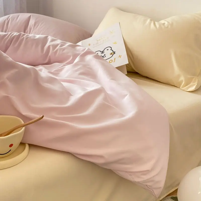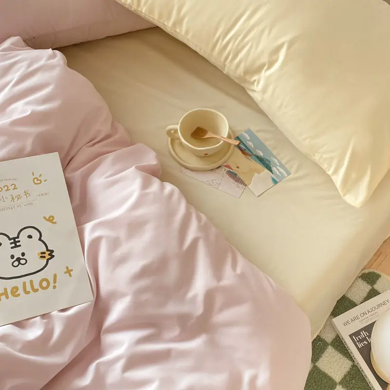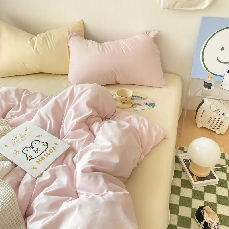 Conjunto de cama coreano para adultos e crianças, cor sólida, gêmeo, completo, queen size, cama macia, lençol plano, capa de edredão, fronhas simples, linho