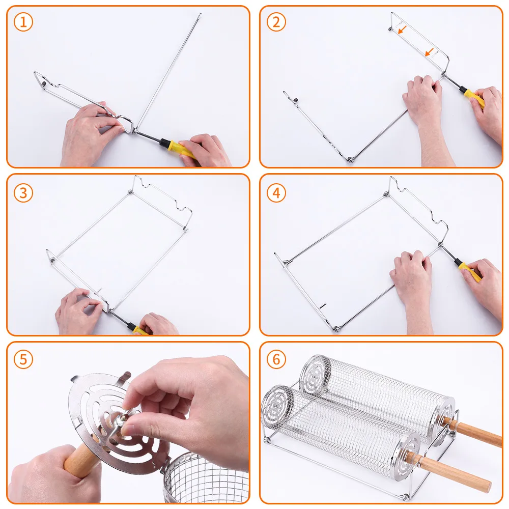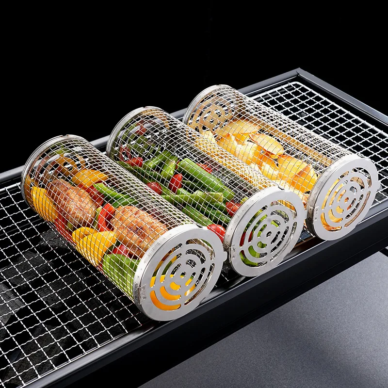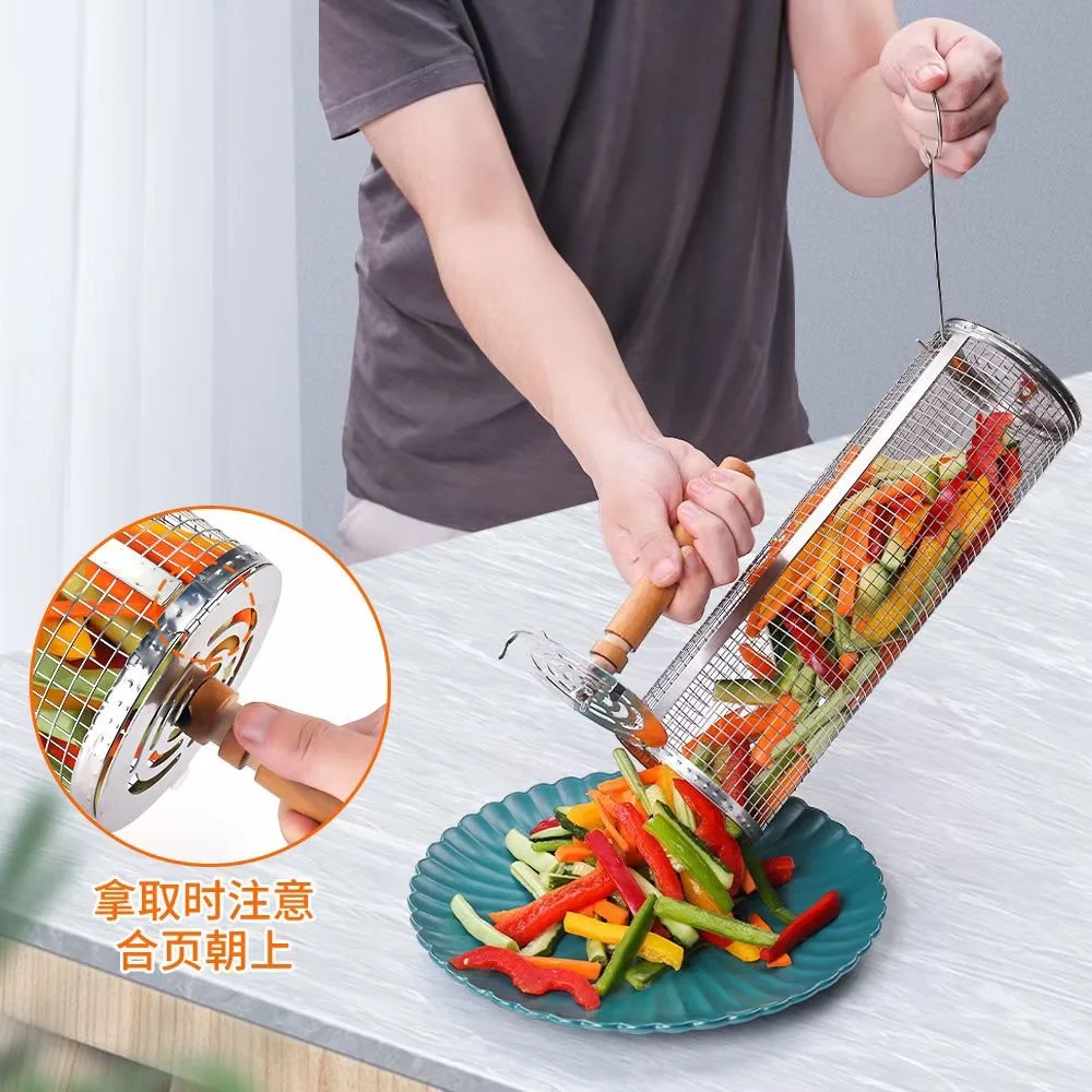 Conjunto de cesta para churrasco em aço inoxidável, Cilindro de malha de arame Rack de acampamento ao ar livre com alça de madeira