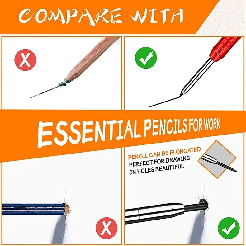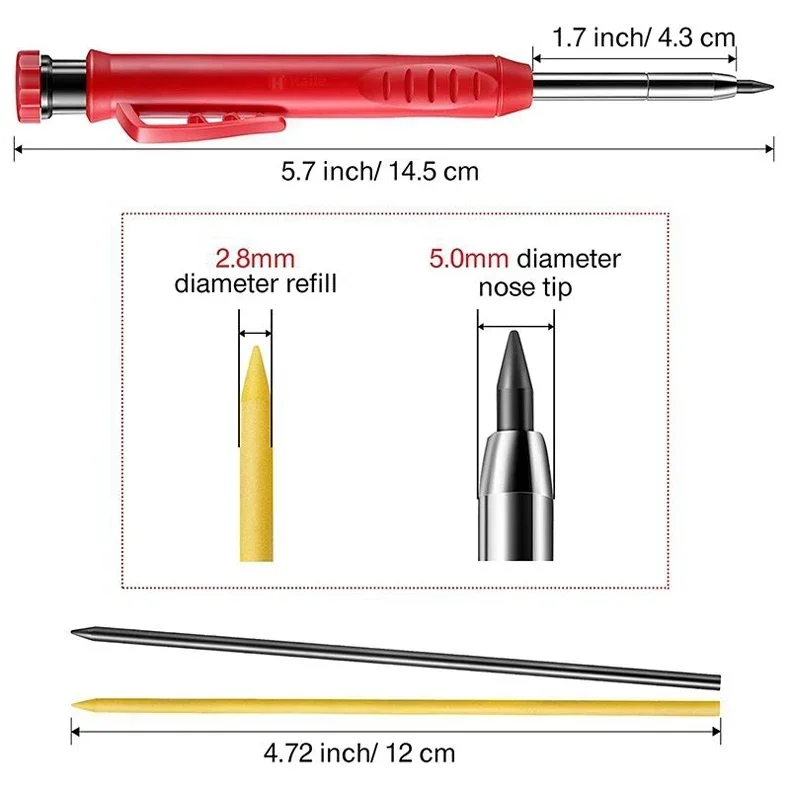 --Design: O apontador de lápis é parafusado na parte superior do lápis e é projetado em uma única peça.O design do clipe da caneta pode ser facilmente pendurado no bolso, não é fácil de perder e melhora a eficiência do trabalho.A ponta da agulha de 45 mm de comprimento pode alcançar áreas de difícil acesso que outros marcadores para marcenaria não conseguem alcançar.É adequado para fazer furos ou outras áreas estreitas.