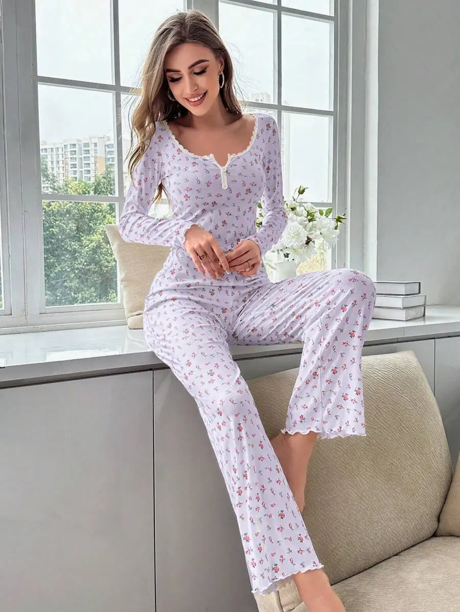 - > Conjunto de pijama feminino rendas botões guarnições pijamas finos calças de manga comprida estampa floral elegante sexy loungewear pijamas