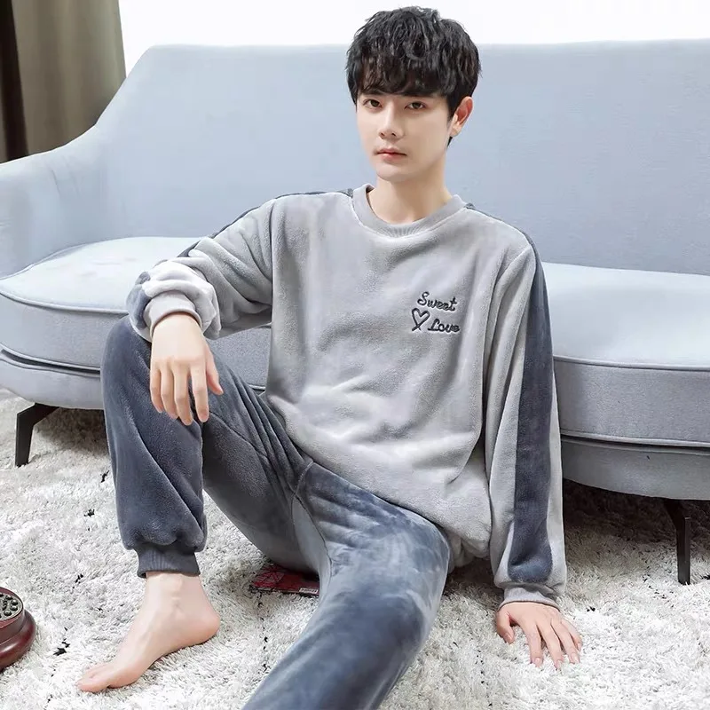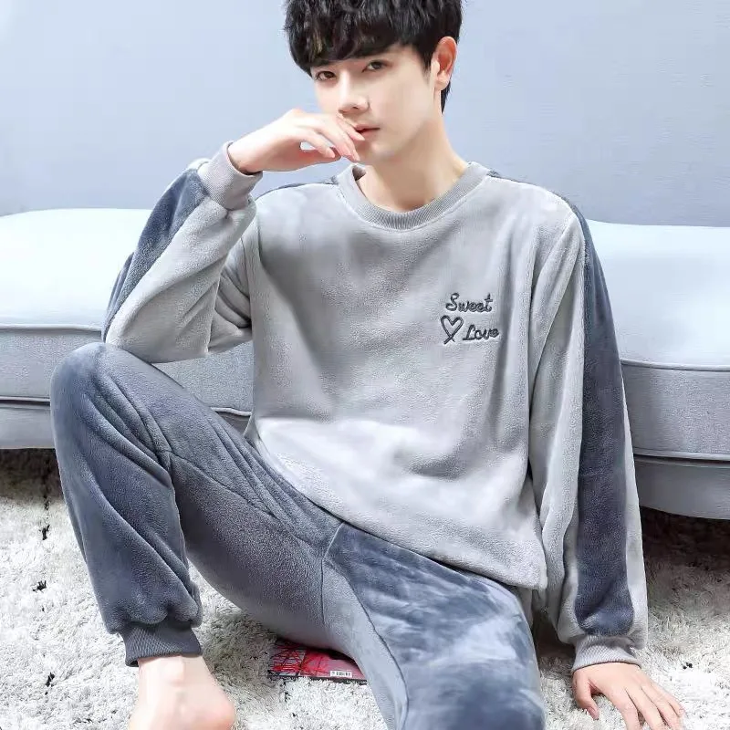 - > Conjunto de pijamas de lã engrossado coral velo flanela casual quente roupas para casa para homens em torno do pescoço calças compridas coleção primavera