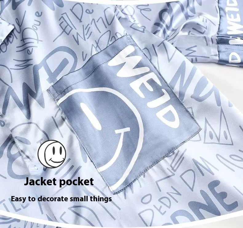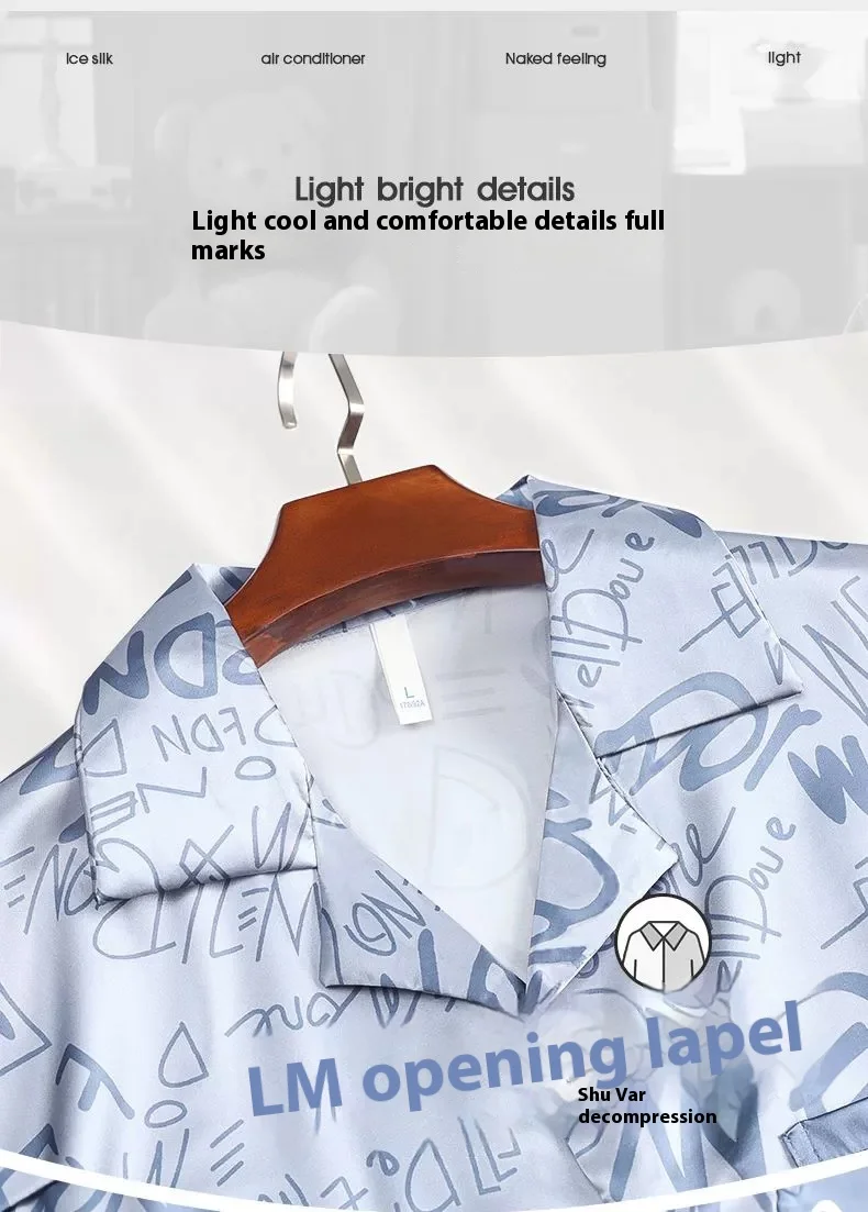 Conjunto de pijamas masculinos de tamanho grande, seda gelo, desenho animado, urso, manga curta, estudante, duas peças, cardigã, lapela, letras sorridentes, código 3xl